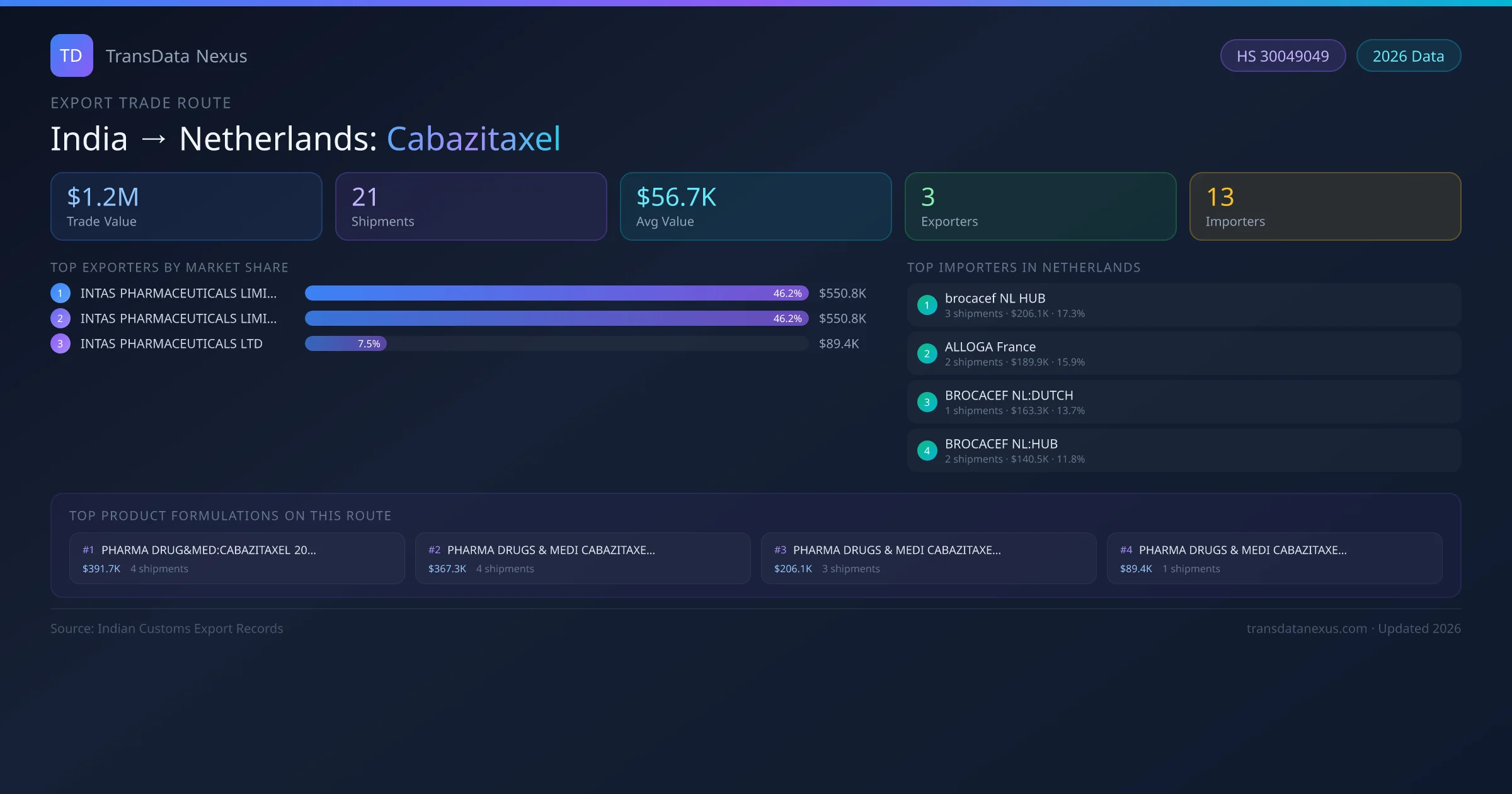 India has recorded 21 verified shipments of Cabazitaxel exported to Netherlands, representing a combined trade value of $1.2M USD. This corridor is served by 3 active Indian exporters, with an average shipment value of $56.7K USD. The leading Indian exporter is INTAS PHARMACEUTICALS LIMITED , which accounts for 46% of total export value with 6 shipments worth $550.8K USD. On the buying side, brocacef NL HUB is the largest importer in Netherlands with $206.1K USD in purchases. The top 3 suppliers β INTAS PHARMACEUTICALS LIMITED , INTAS PHARMACEUTICALS LIMITED, INTAS PHARMACEUTICALS LTD β together control 100% of total trade value on this route. All data sourced from Indian Customs (DGFT) shipping bill records. Values reported in FOB USD.