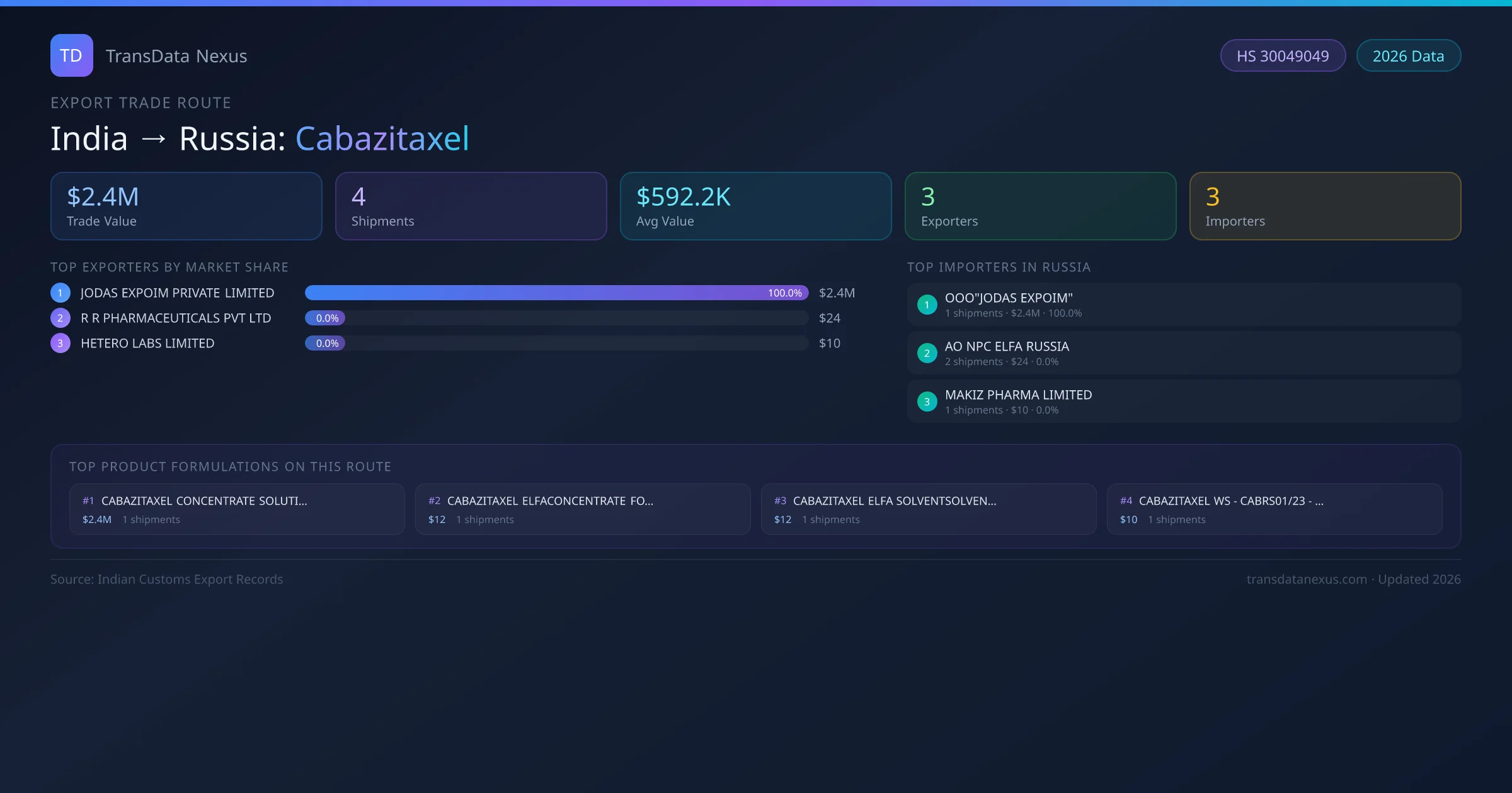 India exports Cabazitaxel to Russia worth approximately $2.4M USD across 4 recorded shipments. The average value per shipment is $592.2K USD.