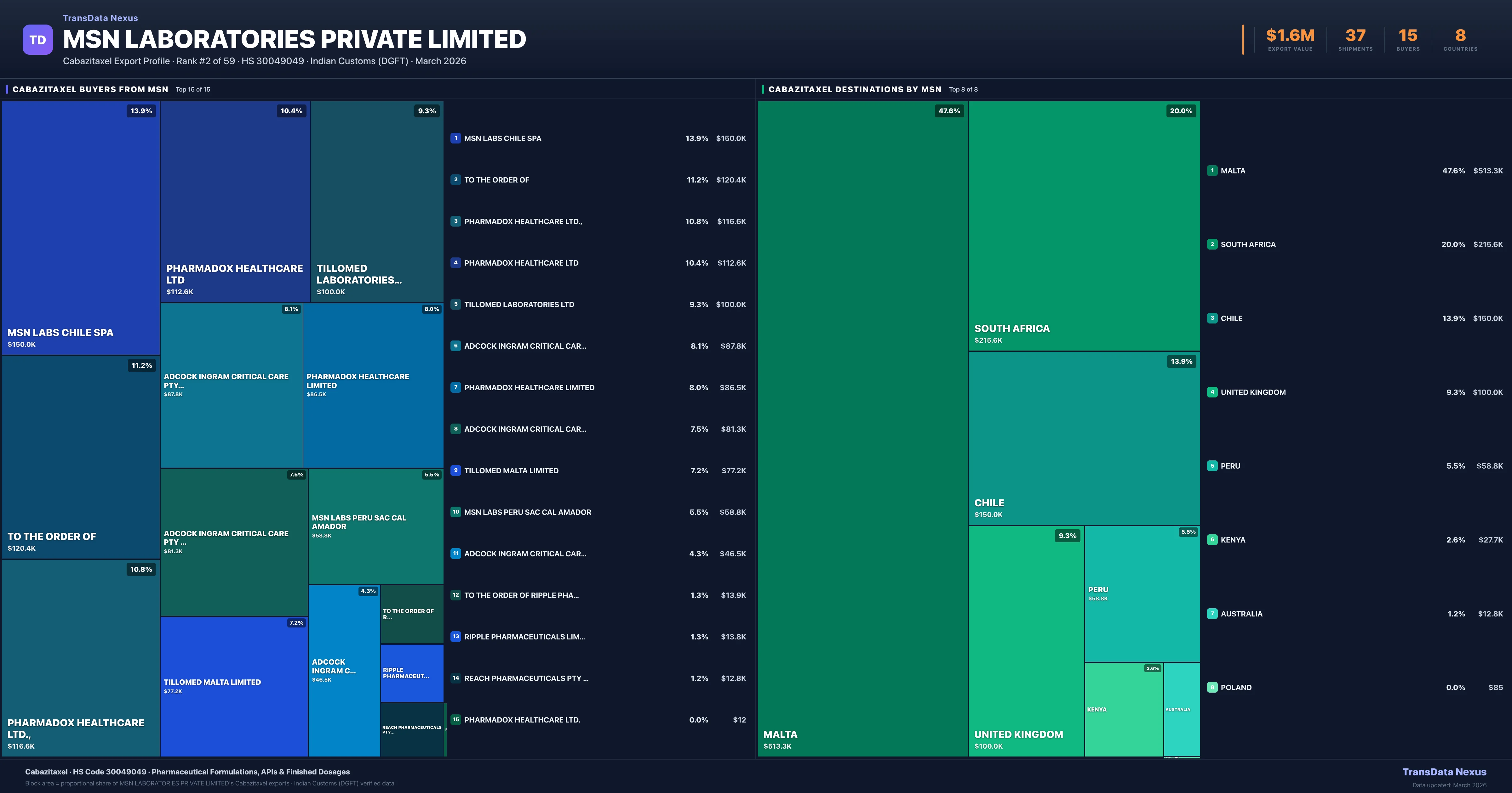 MSN Laboratories Private Limited supplies Cabazitaxel to 15 buyers globally. The largest buyer is MSN LABS CHILE SPA (CHILE), followed by TO THE ORDER OF (MALTA) and PHARMADOX HEALTHCARE LTD., (MALTA). These buyers represent pharmaceutical distributors, hospital groups, and government procurement agencies in their respective markets.