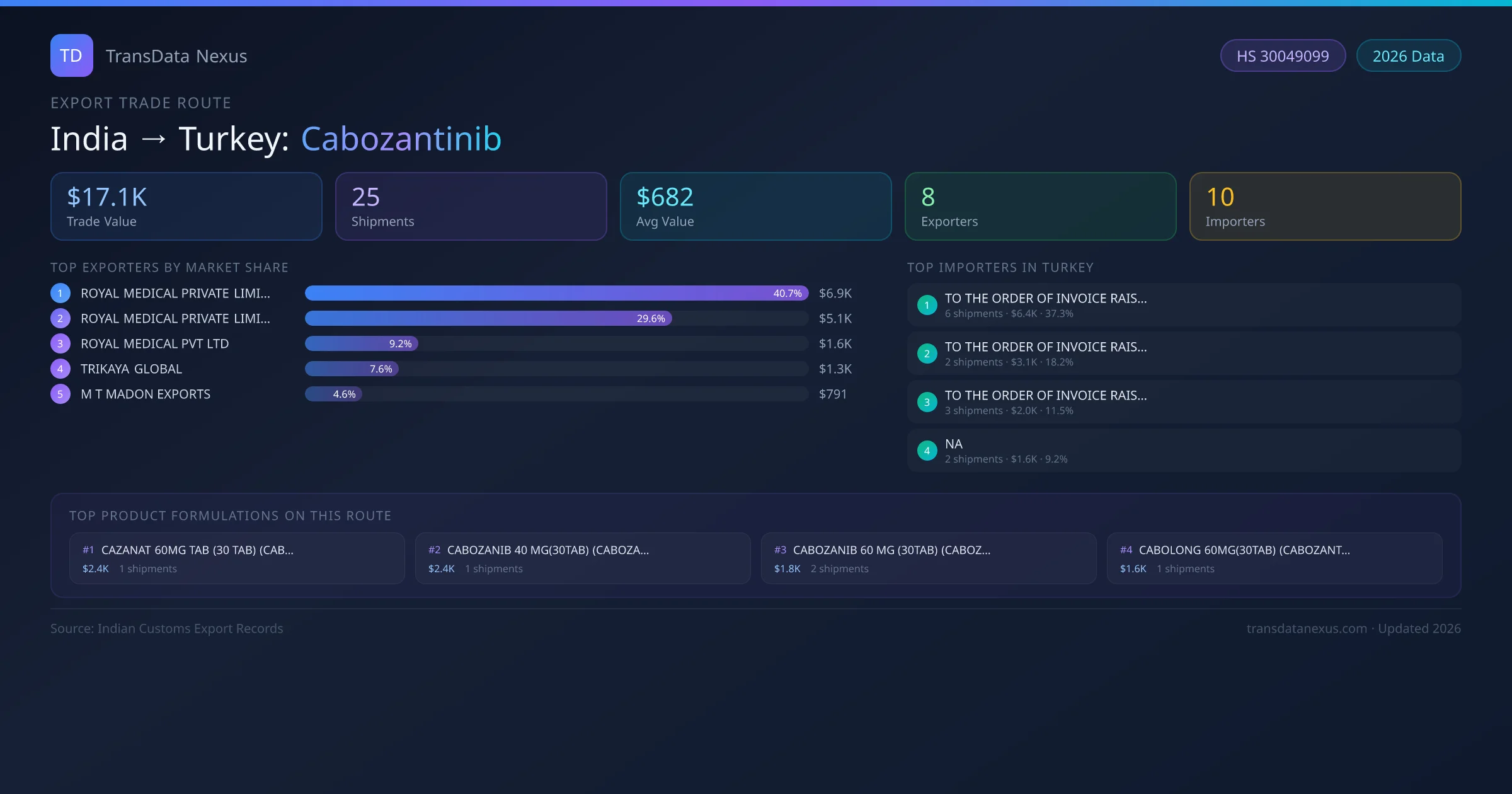 The India to Turkey Cabozantinib corridor is one of India's established pharmaceutical export routes, with 25 shipments documented worth a combined $17.1K USD. The route is dominated by ROYAL MEDICAL PRIVATE LIMITED, which alone accounts for roughly 41% of all export value, reflecting the consolidated nature of India's cabozantinib manufacturing sector.