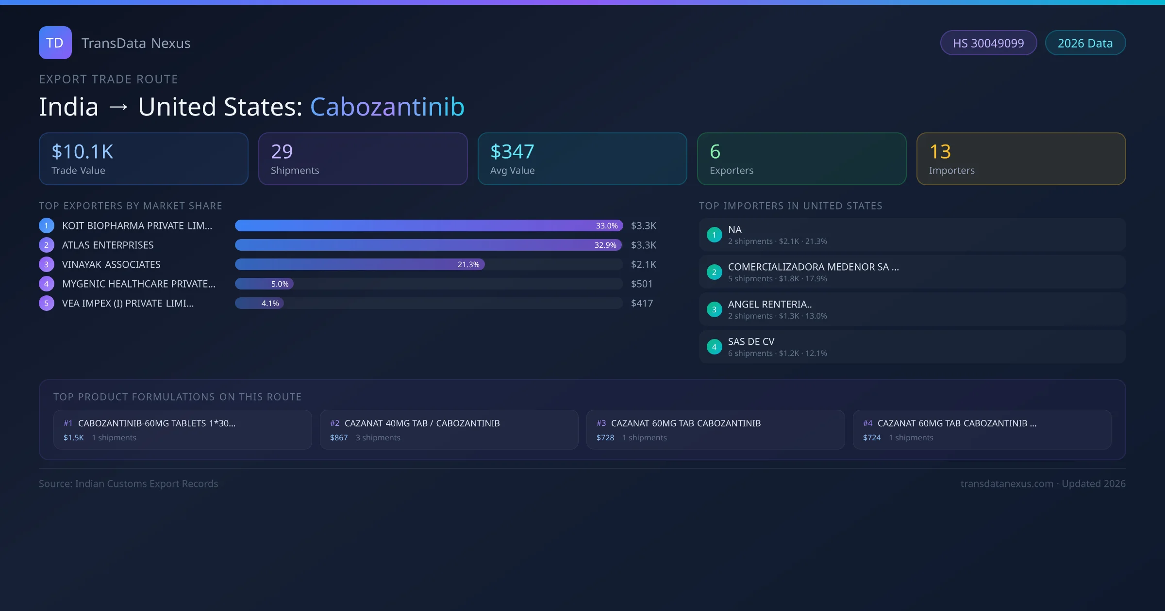 India has recorded 29 verified shipments of Cabozantinib exported to United States, representing a combined trade value of $10.1K USD. This corridor is served by 6 active Indian exporters, with an average shipment value of $347 USD. The leading Indian exporter is KOIT BIOPHARMA PRIVATE LIMITED, which accounts for 33% of total export value with 8 shipments worth $3.3K USD. On the buying side, NA is the largest importer in United States with $2.1K USD in purchases. The top 3 suppliers — KOIT BIOPHARMA PRIVATE LIMITED, ATLAS ENTERPRISES, VINAYAK ASSOCIATES — together control 87% of total trade value on this route. All data sourced from Indian Customs (DGFT) shipping bill records. Values reported in FOB USD.