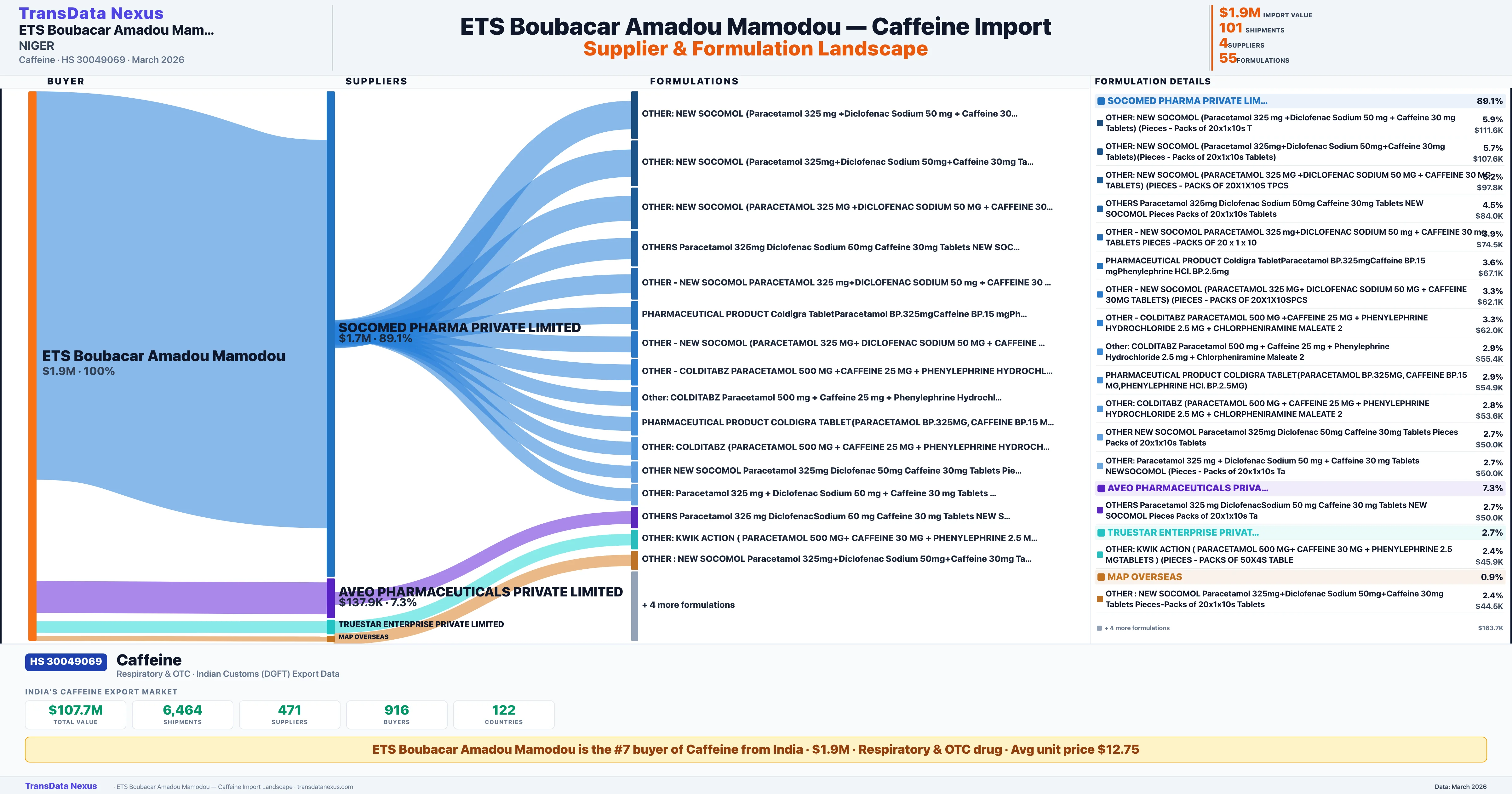 ETS BOUBACAR AMADOU MAMODOU imports 55 distinct Caffeine formulations from India. The top formulation is OTHER: NEW SOCOMOL (Paracetamol 325 mg +Diclofenac Sodium 50 with 4 shipments worth $111.6K.