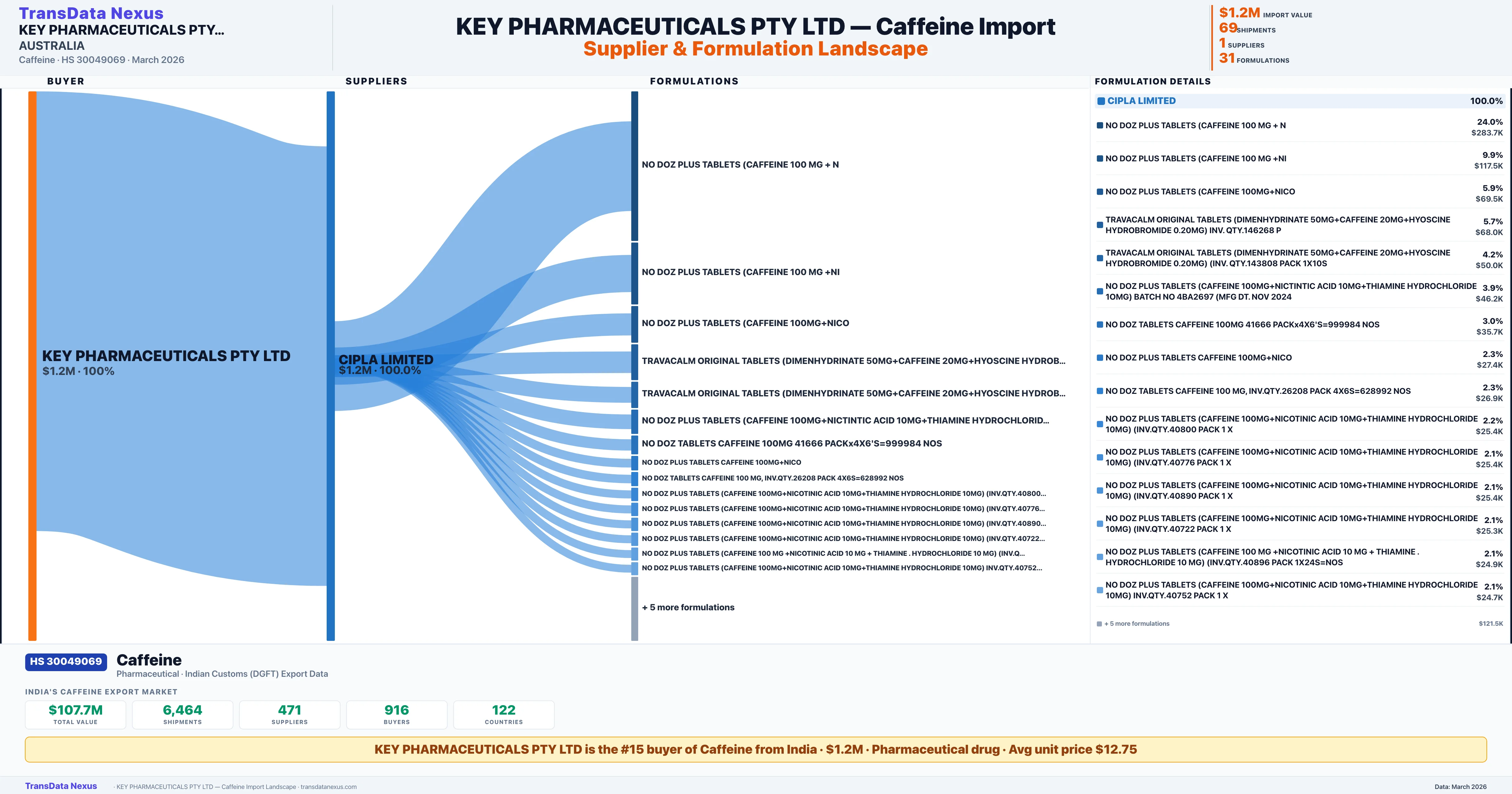 KEY PHARMACEUTICALS PTY LTD sources Caffeine from 1 verified Indian supplier: CIPLA LIMITED ($1.2M, 100.0%). This is based on 69 customs records.