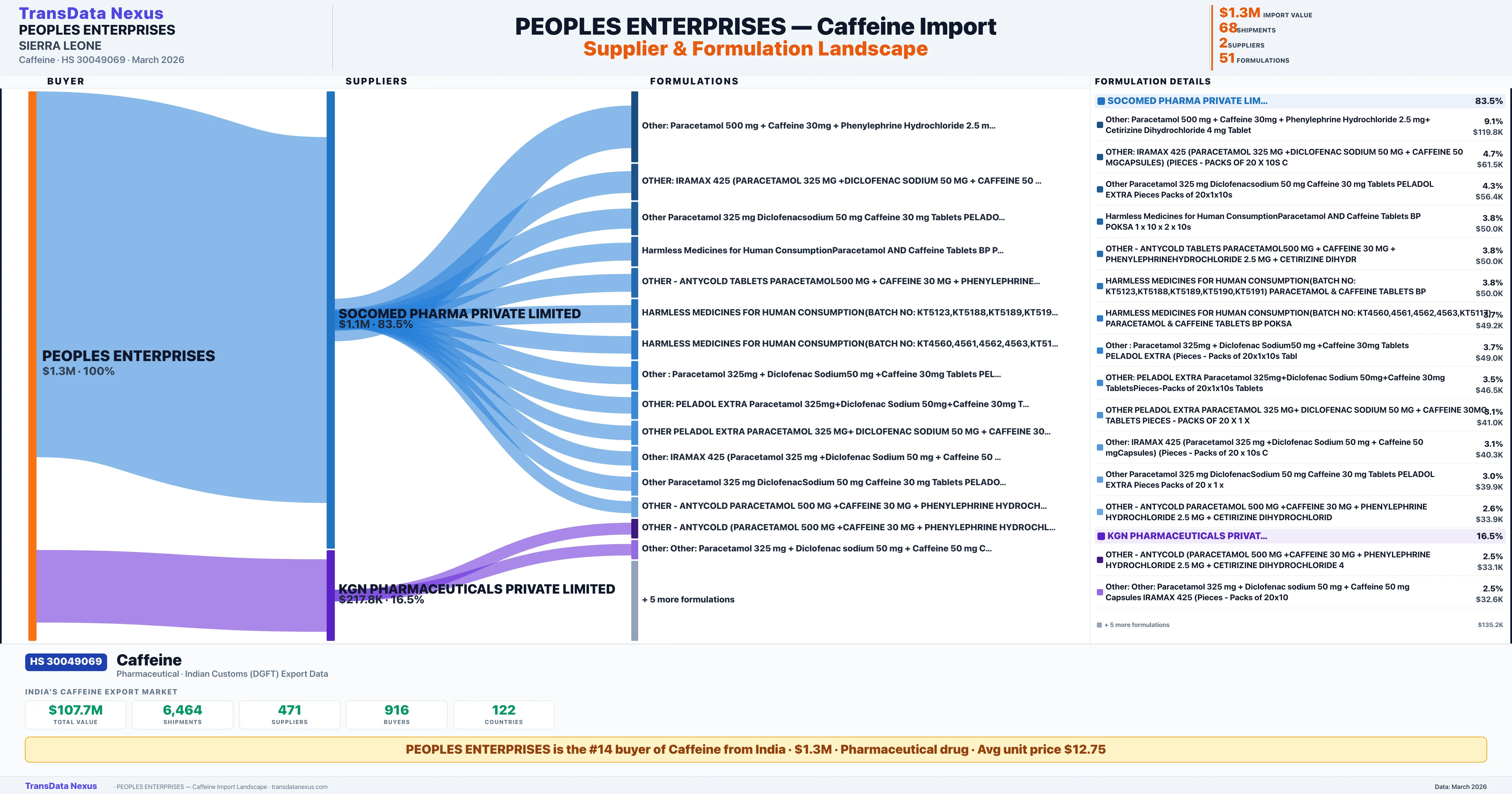 PEOPLES ENTERPRISES imports 51 distinct Caffeine formulations from India. The top formulation is Other: Paracetamol 500 mg + Caffeine 30mg + Phenylephrine Hy with 7 shipments worth $119.8K.