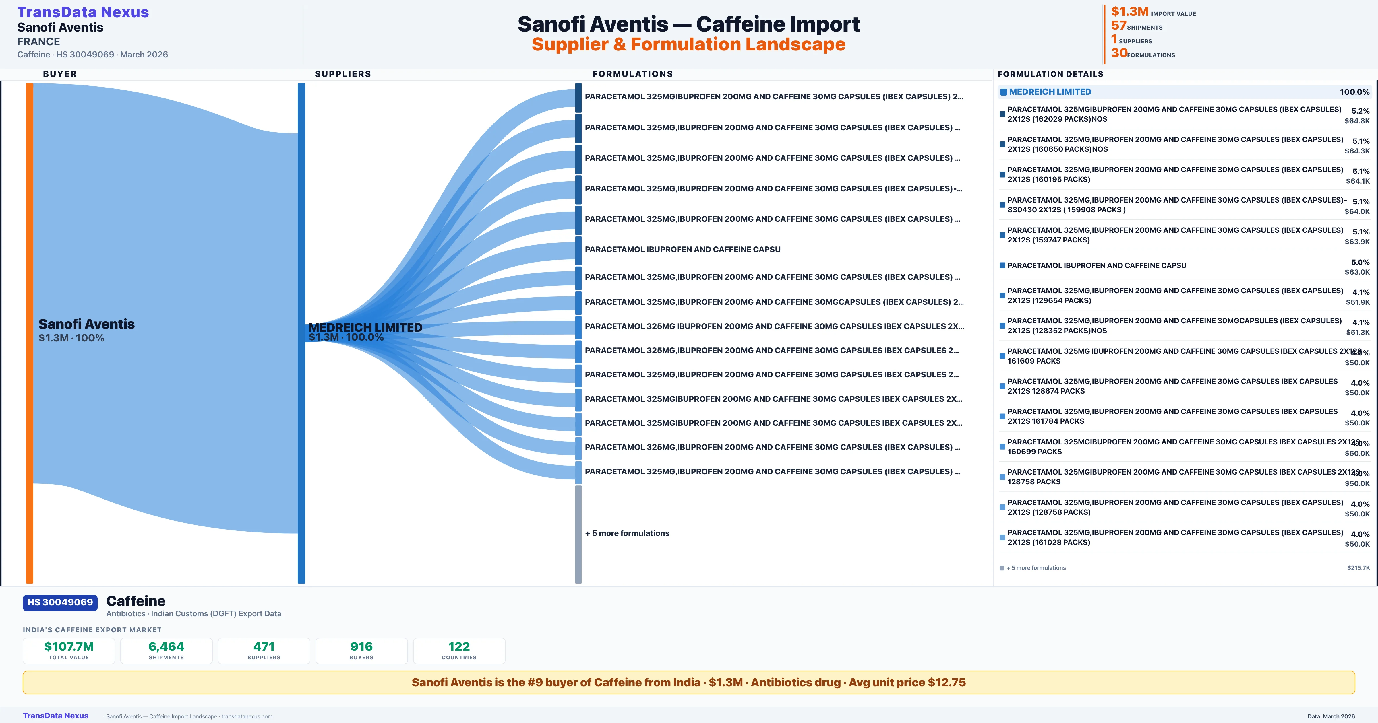 SANOFI AVENTIS sources Caffeine from 1 verified Indian supplier: MEDREICH LIMITED ($1.3M, 100.0%). This is based on 57 customs records.
