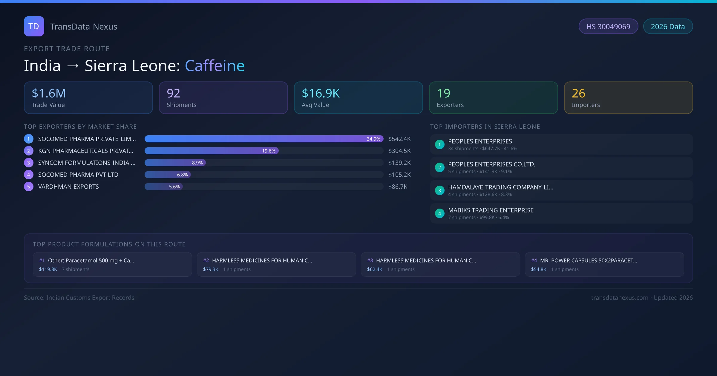 India has recorded 92 verified shipments of Caffeine exported to Sierra Leone, representing a combined trade value of $1.6M USD. This corridor is served by 19 active Indian exporters, with an average shipment value of $16.9K USD. The leading Indian exporter is SOCOMED PHARMA PRIVATE LIMITED, which accounts for 35% of total export value with 28 shipments worth $542.4K USD. On the buying side, PEOPLES ENTERPRISES is the largest importer in Sierra Leone with $647.7K USD in purchases. The top 3 suppliers — SOCOMED PHARMA PRIVATE LIMITED, KGN PHARMACEUTICALS PRIVATE LIMITED, SYNCOM FORMULATIONS INDIA LIMITED — together control 63% of total trade value on this route. All data sourced from Indian Customs (DGFT) shipping bill records. Values reported in FOB USD.