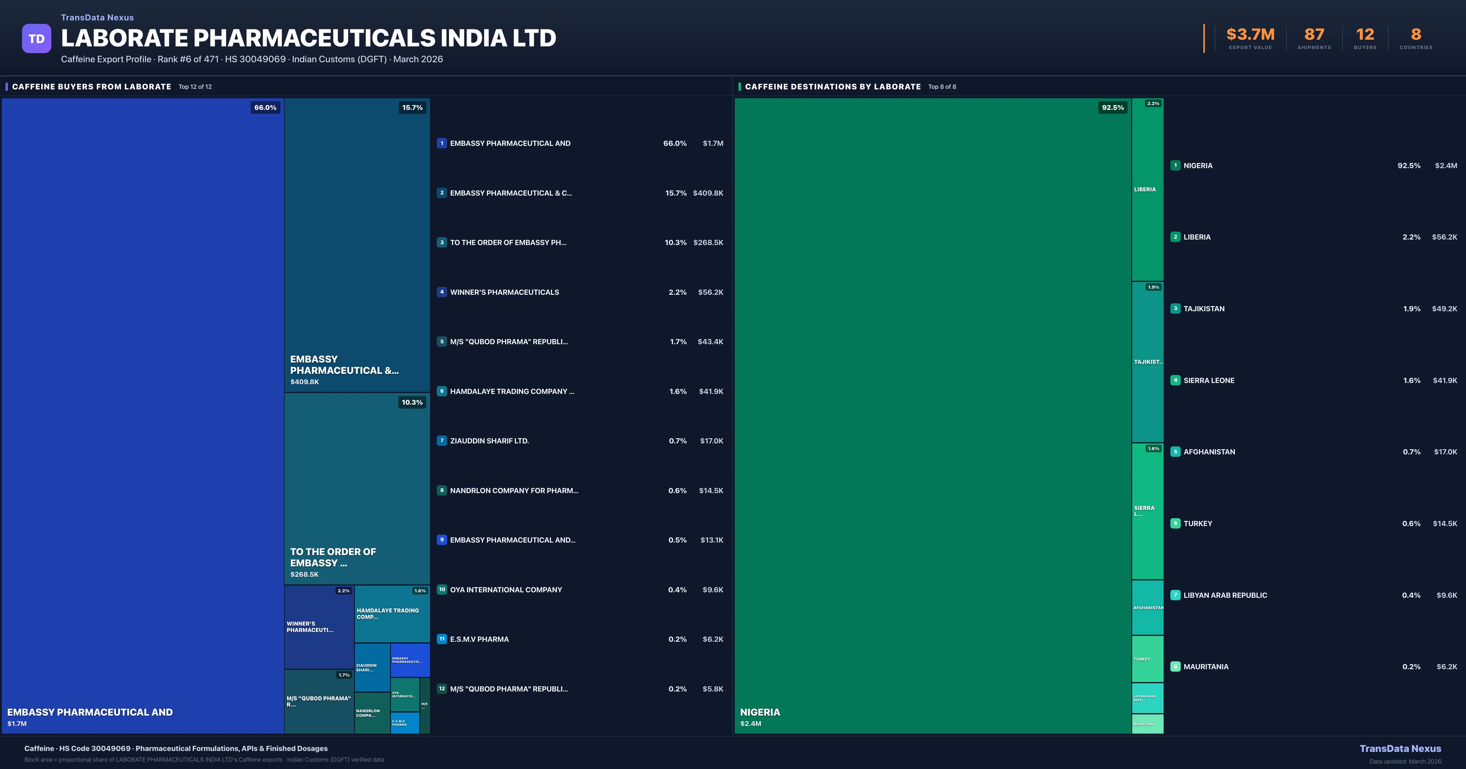 Laborate Pharmaceuticals India Ltd supplies Caffeine to 12 buyers globally. The largest buyer is EMBASSY PHARMACEUTICAL AND (NIGERIA), followed by EMBASSY PHARMACEUTICAL & CHEMICALS (NIGERIA) and TO THE ORDER OF EMBASSY PHARMACEUTI (NIGERIA). These buyers represent pharmaceutical distributors, hospital groups, and government procurement agencies in their respective markets.