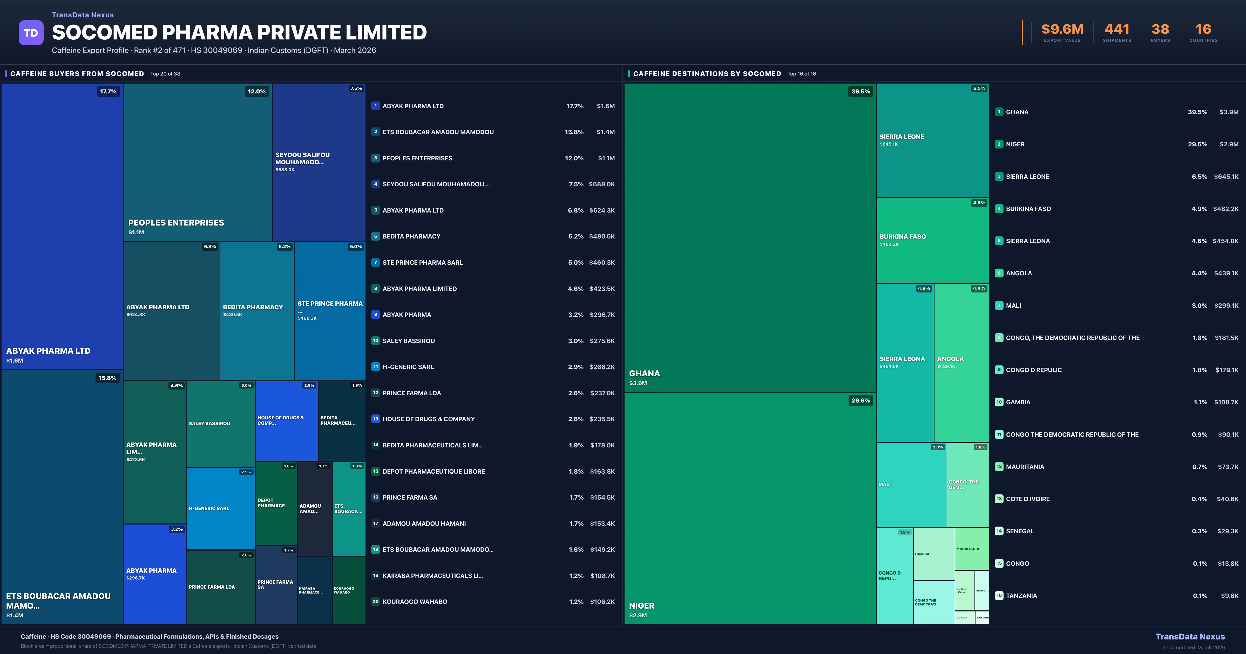Socomed Pharma Private Limited supplies Caffeine to 38 buyers globally. The largest buyer is ABYAK PHARMA LTD (GHANA), followed by ETS BOUBACAR AMADOU MAMODOU (NIGER) and PEOPLES ENTERPRISES (SIERRA LEONE). These buyers represent pharmaceutical distributors, hospital groups, and government procurement agencies in their respective markets.