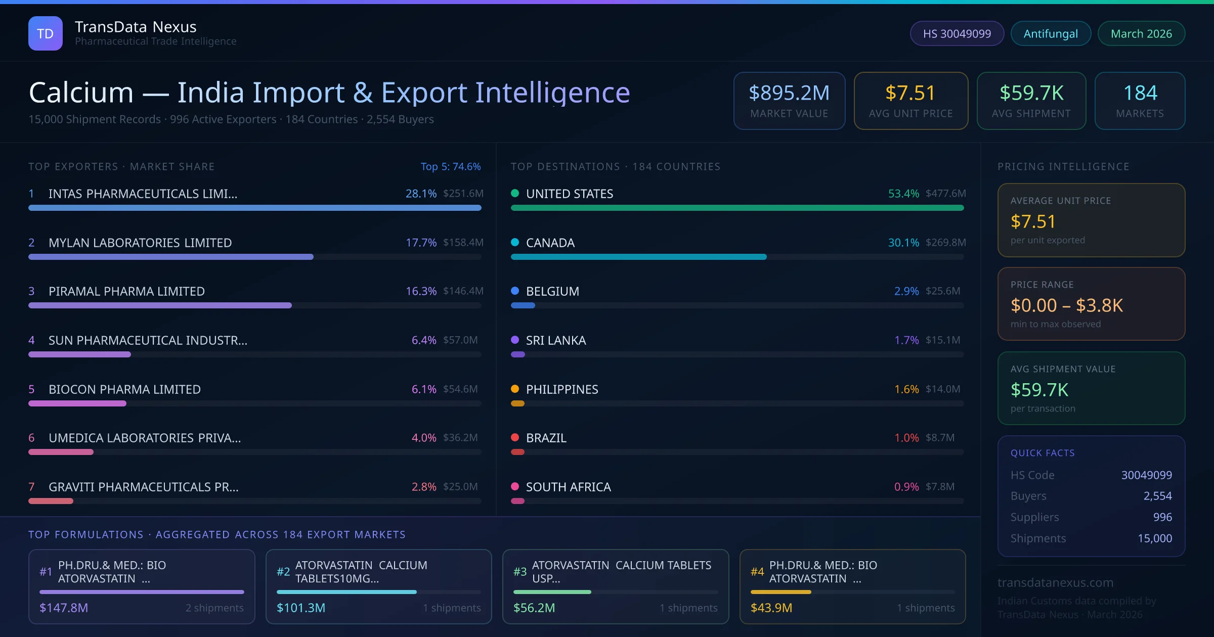 Between 2022 and 2026, India exported $895.2M worth of calcium across 15,000 verified shipments to 184 countries — covering 94% of world markets in the Nutritional Supplements segment. The largest destination is UNITED STATES (53.4%). INTAS PHARMACEUTICALS LIMITED leads with a 28.1% share. All figures are drawn from Indian Customs (DGFT) shipping bill records spanning four years of trade activity.