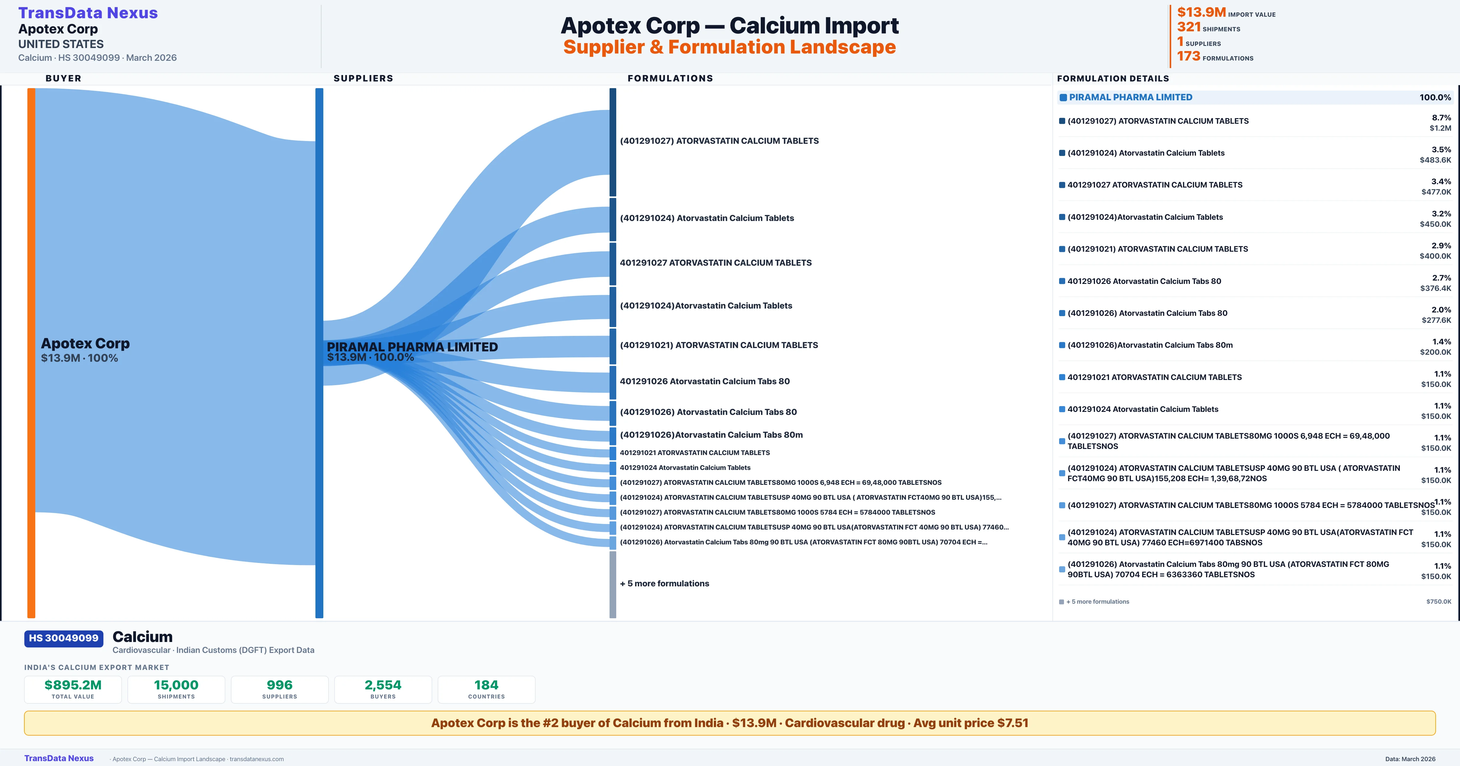 APOTEX CORP sources Calcium from 1 verified Indian supplier: PIRAMAL PHARMA LIMITED ($13.9M, 100.0%). This is based on 321 customs records.