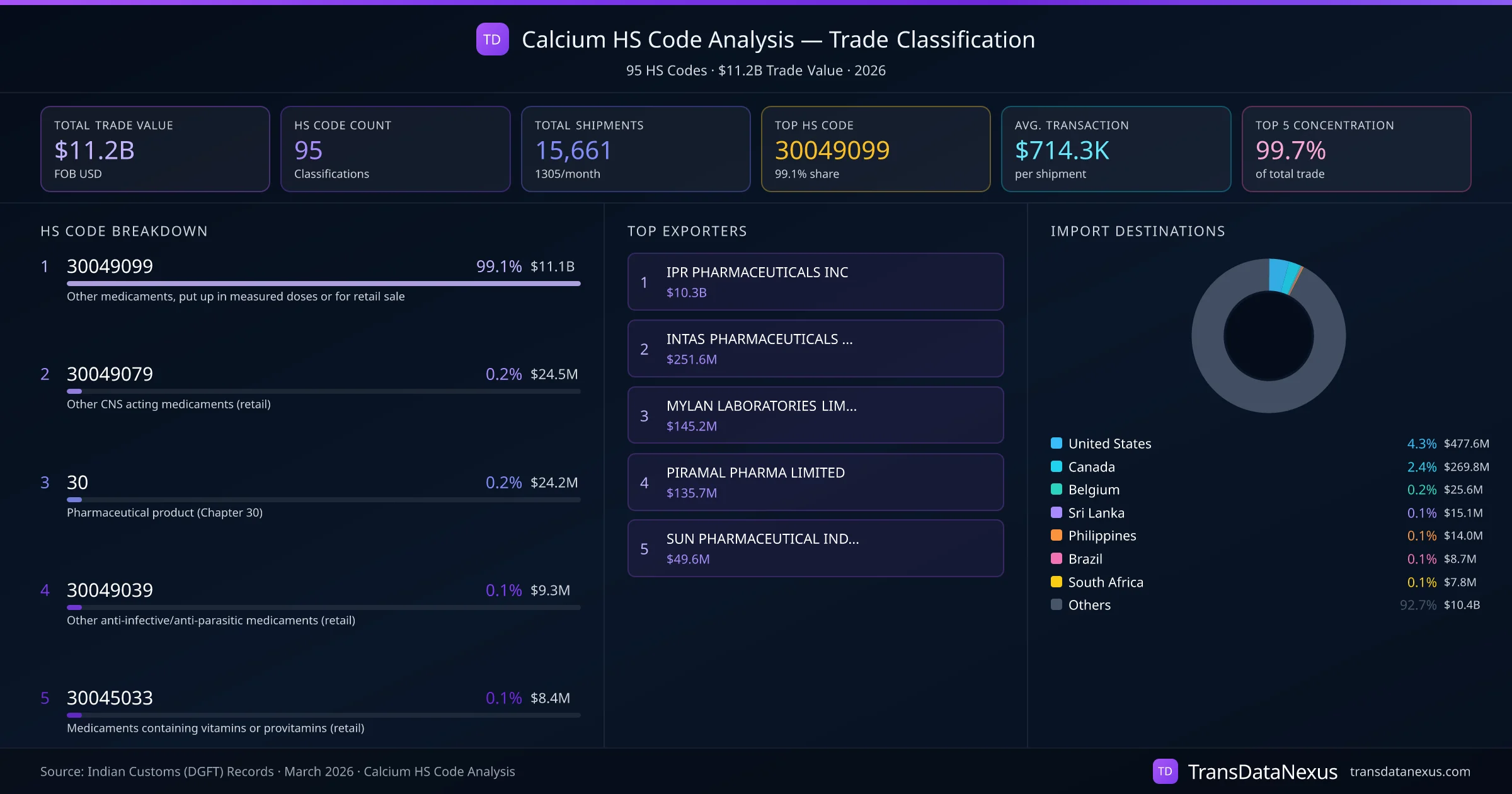 India exports Calcium under 95 distinct HS code classifications, representing a total trade value of $11.2B across 15,661 shipments. The dominant classification is HS 30049099 (Other medicaments, put up in measured doses or for retail sale), accounting for 99.1% of all Calcium trade at $11.1B. HS 30049079 (Other CNS acting medicaments (retail)) follows at 0.2% ($24.5M). The top 5 HS codes together account for 99.7% of total Calcium trade from India. The average transaction value is $714329. Key importing markets include United States, Canada, Belgium. Leading exporters include IPR PHARMACEUTICALS INC and INTAS PHARMACEUTICALS LIMITED. Data sourced from Indian Customs (DGFT) shipping bill records.