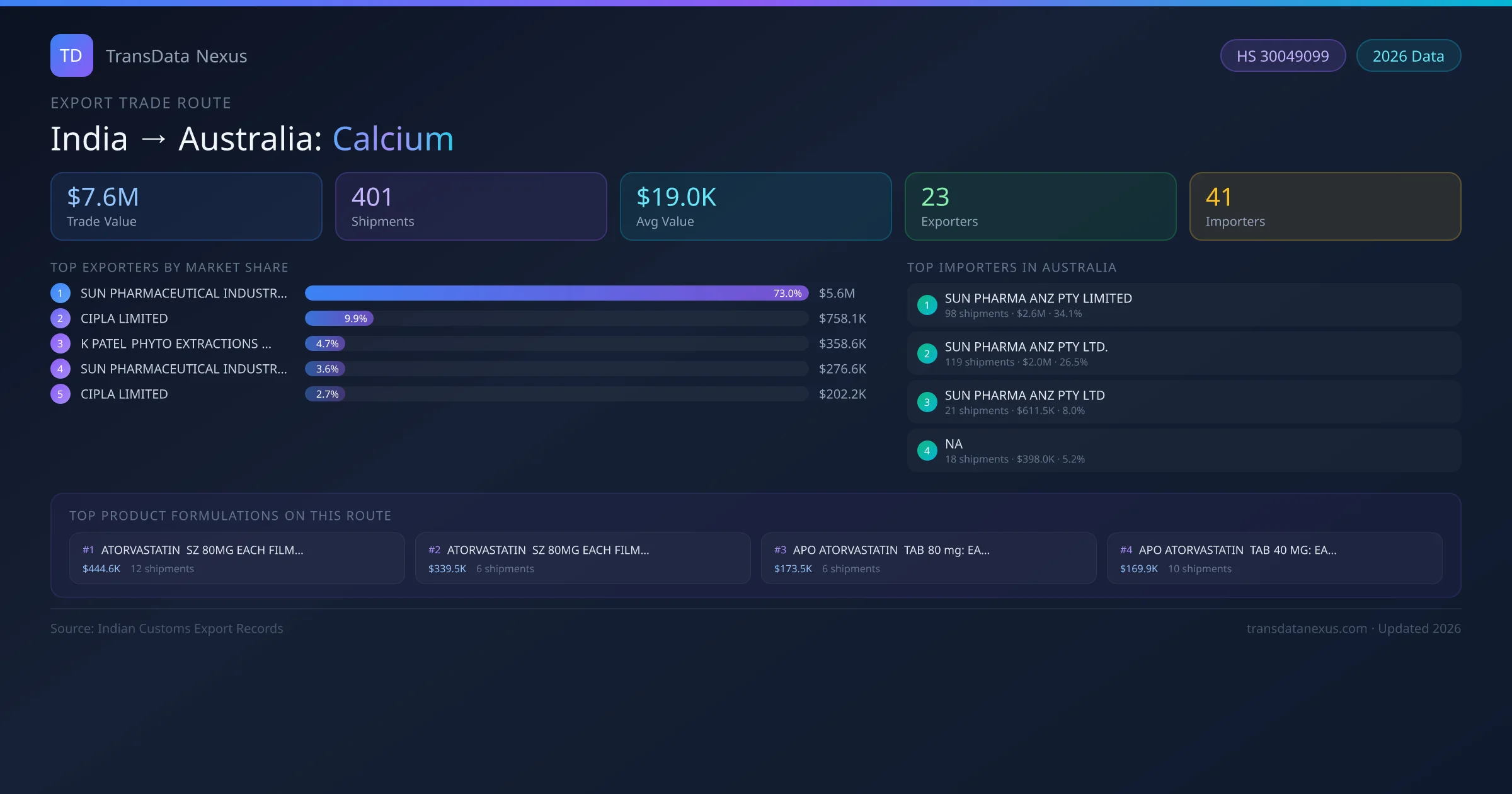 The India to Australia Calcium corridor is one of India's established pharmaceutical export routes, with 401 shipments documented worth a combined $7.6M USD. The route is dominated by SUN PHARMACEUTICAL INDUSTRIES LIMITED, which alone accounts for roughly 73% of all export value, reflecting the consolidated nature of India's calcium manufacturing sector.