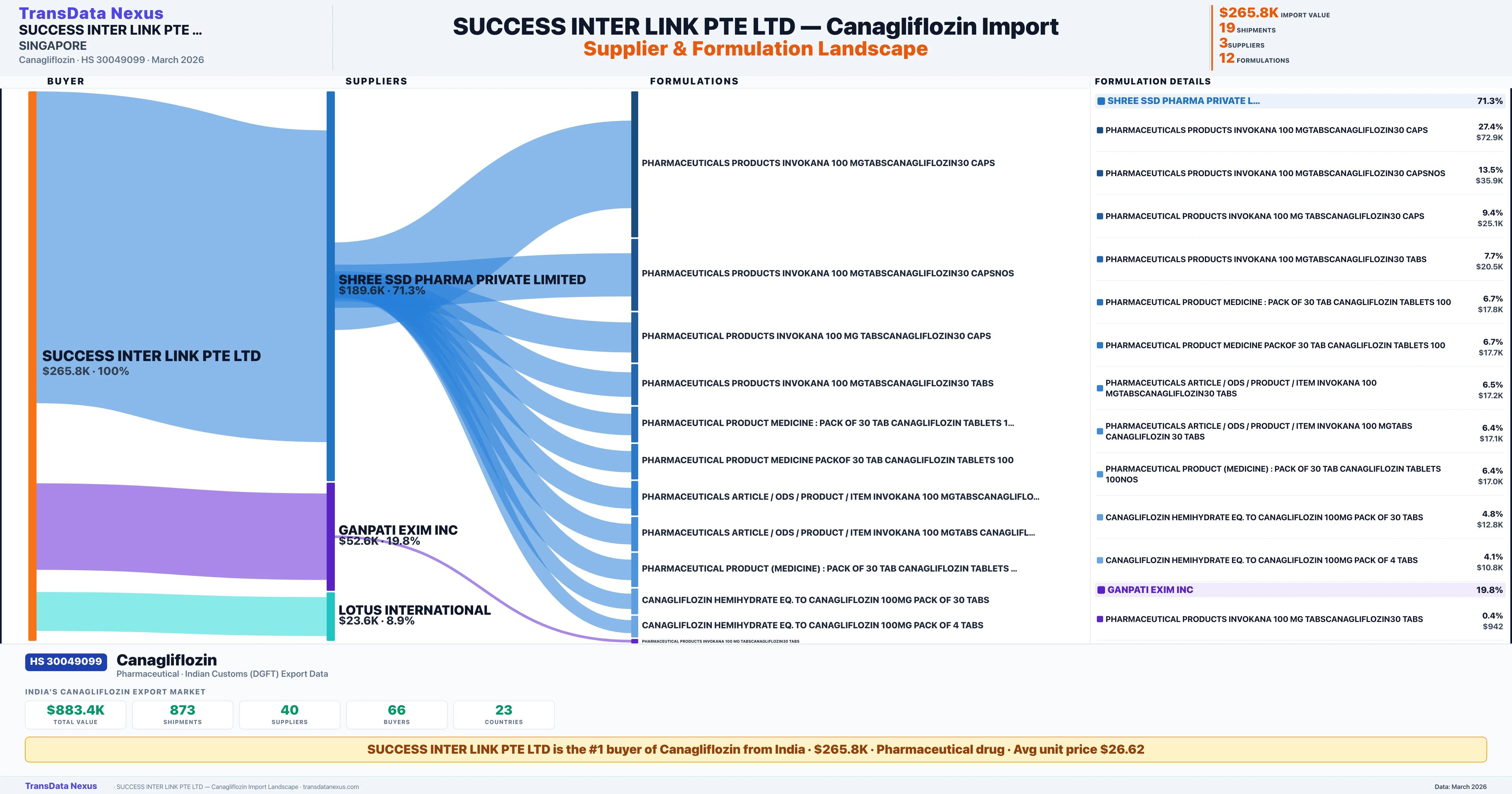SUCCESS INTER LINK PTE LTD sources Canagliflozin from 3 verified Indian suppliers: SHREE SSD PHARMA PRIVATE LIMITED ($189.6K, 71.3%), GANPATI EXIM INC ($52.6K, 19.8%), LOTUS INTERNATIONAL ($23.6K, 8.9%). This is based on 19 customs records.