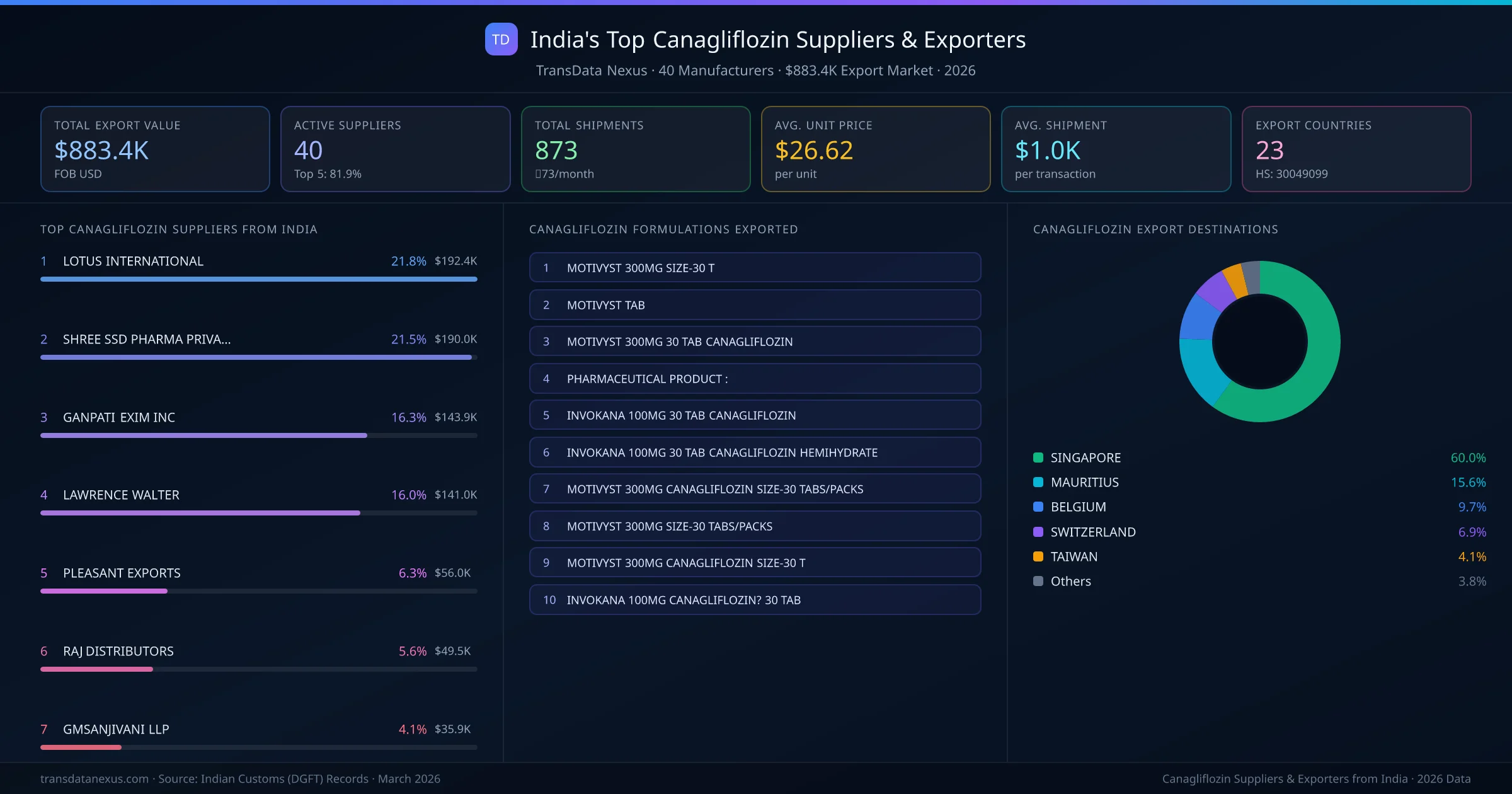 India has 40 active canagliflozin exporters with a combined export market of $883.4K across 873 shipments to 23 countries. The top 5 suppliers hold 81.9% of total export value.