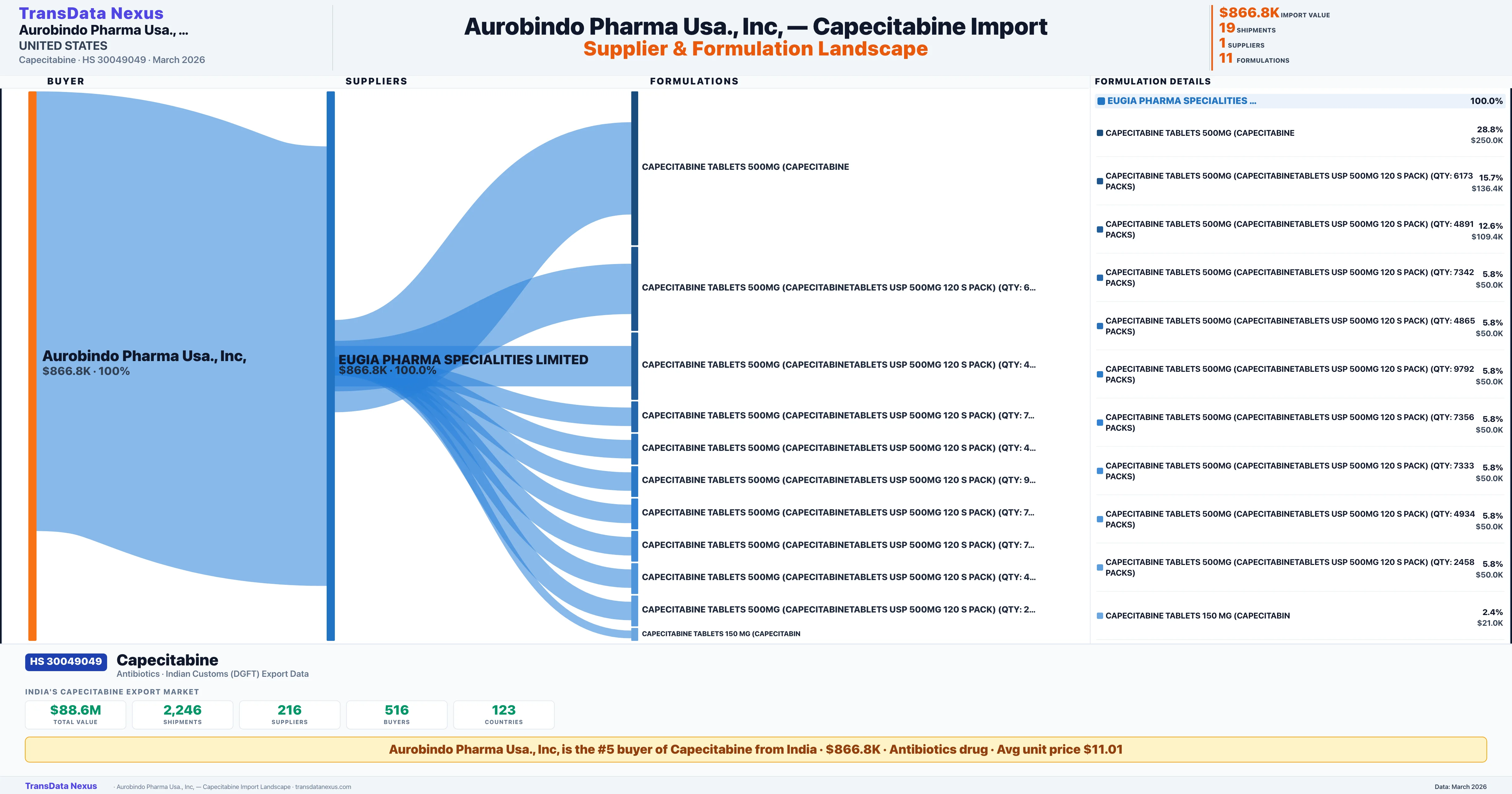 AUROBINDO PHARMA USA., INC, sources Capecitabine from 1 verified Indian supplier: EUGIA PHARMA SPECIALITIES LIMITED ($866.8K, 100.0%). This is based on 19 customs records.