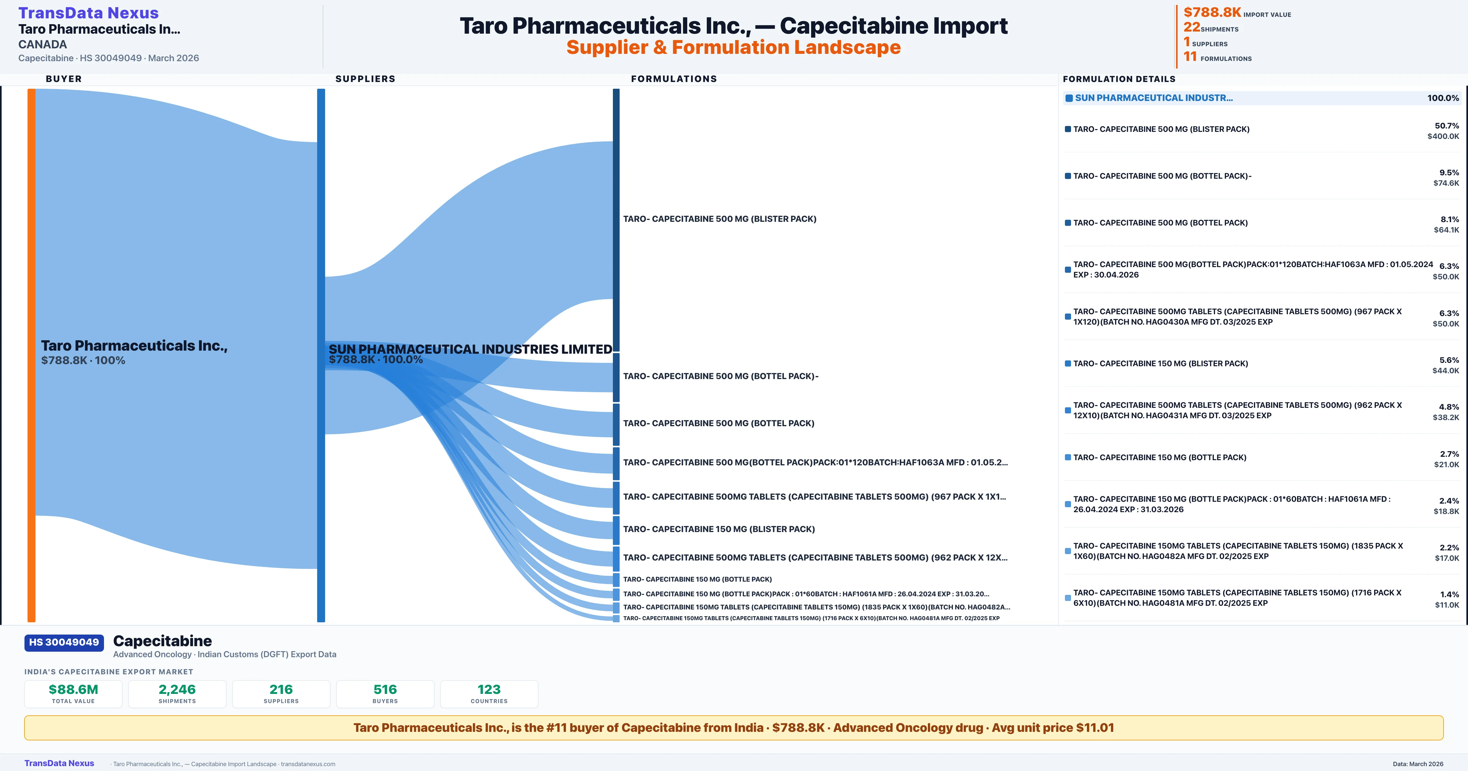 TARO PHARMACEUTICALS INC. sources Capecitabine from 1 verified Indian supplier: SUN PHARMACEUTICAL INDUSTRIES LIMITED ($788.8K, 100.0%). This is based on 22 customs records.