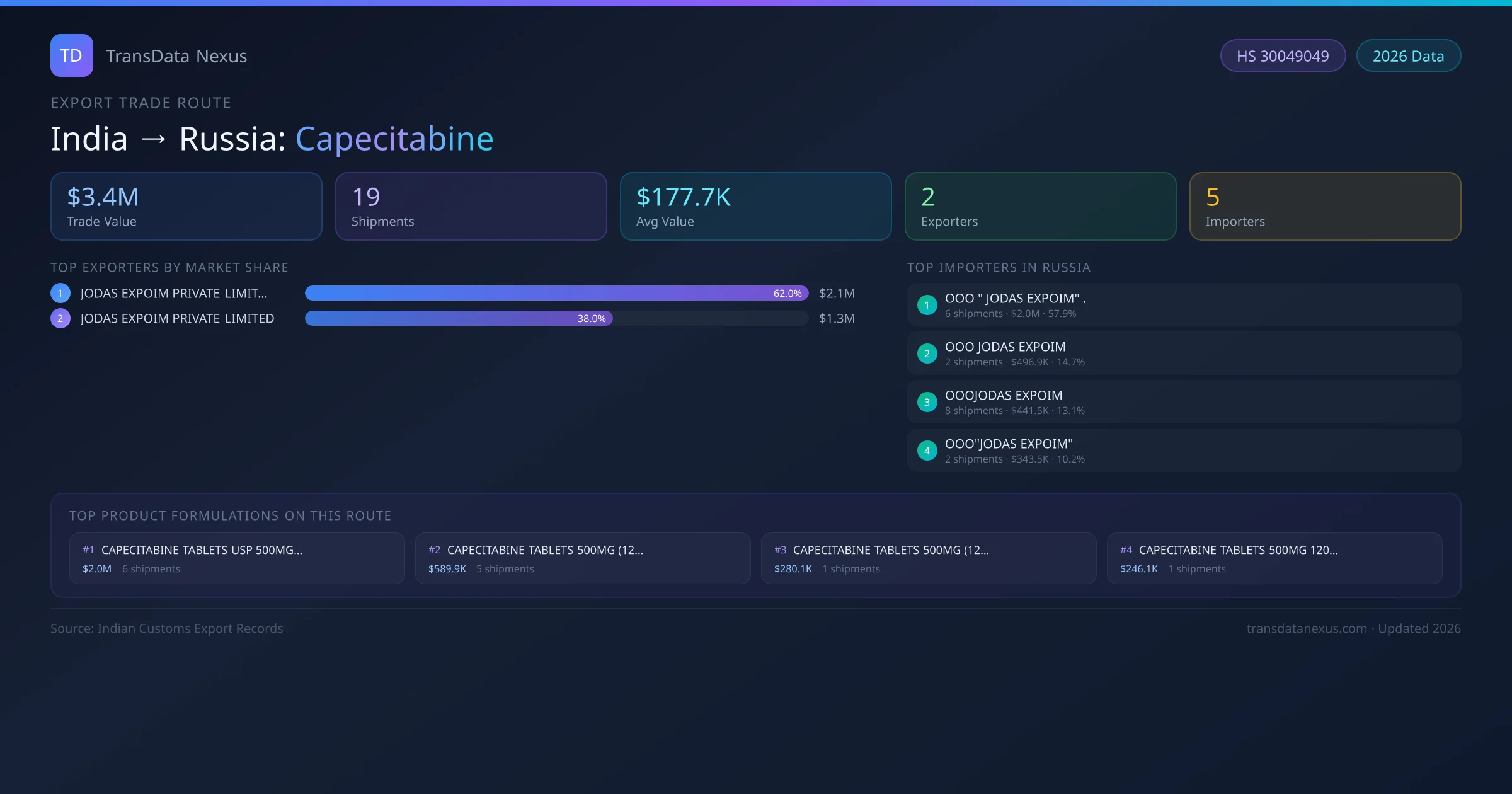 On the buying side, OOO " JODAS EXPOIM" . is the largest importer with 6 shipments worth $2.0M USD — representing 58% of all capecitabine imports from India on this route.