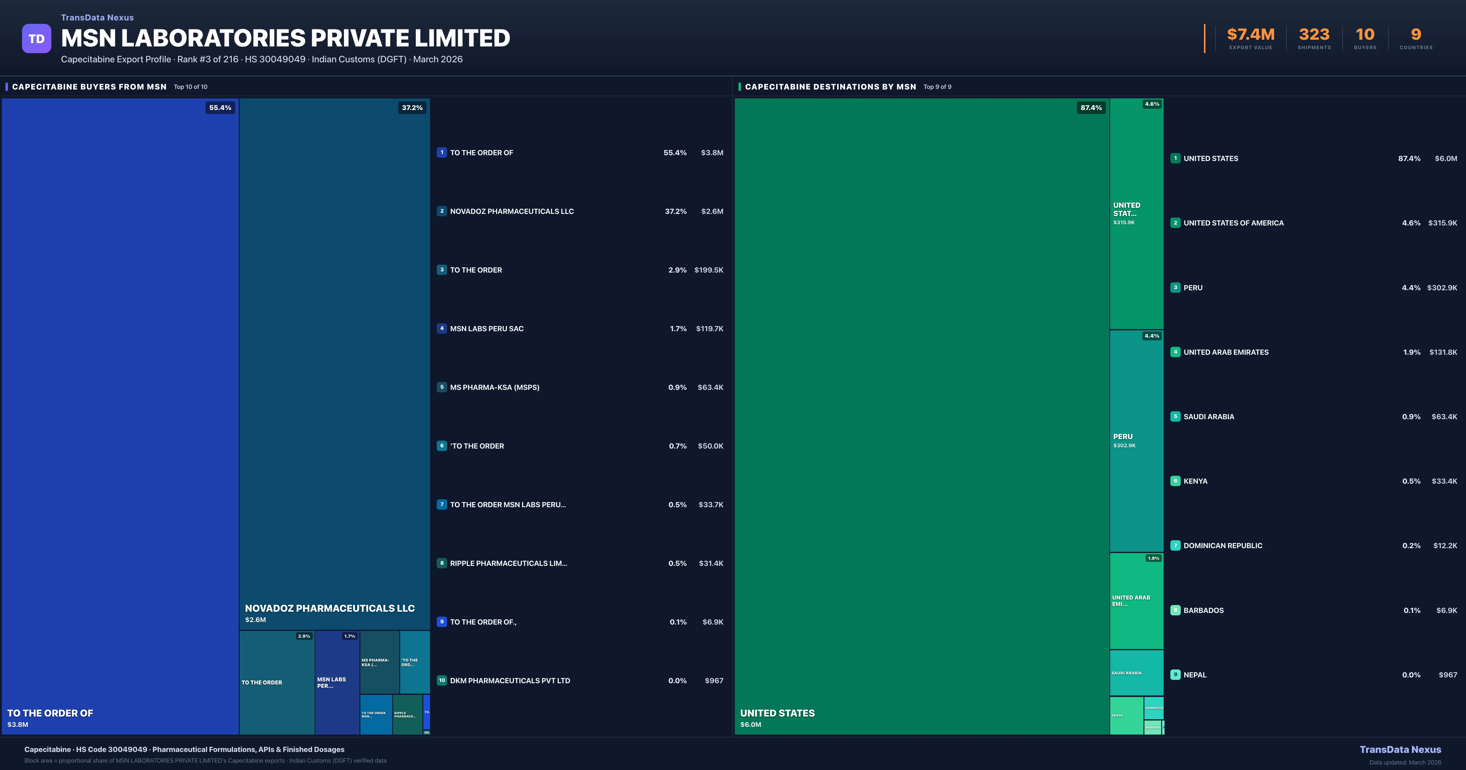 MSN Laboratories Private Limited supplies Capecitabine to 10 buyers globally. The largest buyer is TO THE ORDER OF (UNITED STATES), followed by NOVADOZ PHARMACEUTICALS LLC (UNITED STATES) and TO THE ORDER (UNITED STATES). These buyers represent pharmaceutical distributors, hospital groups, and government procurement agencies in their respective markets.