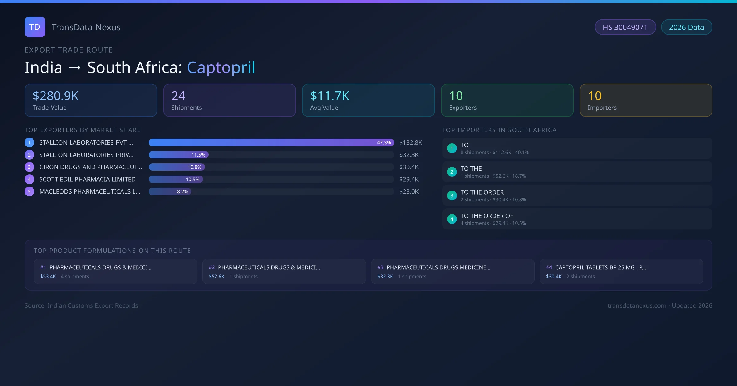 India has recorded 24 verified shipments of Captopril exported to South Africa, representing a combined trade value of $280.9K USD. This corridor is served by 10 active Indian exporters, with an average shipment value of $11.7K USD. The leading Indian exporter is STALLION LABORATORIES PVT LTD, which accounts for 47% of total export value with 8 shipments worth $132.8K USD. On the buying side, TO is the largest importer in South Africa with $112.6K USD in purchases. The top 3 suppliers — STALLION LABORATORIES PVT LTD, STALLION LABORATORIES PRIVATE LIMITED, CIRON DRUGS AND PHARMACEUTICALS PRIVATE LIMITED — together control 70% of total trade value on this route. All data sourced from Indian Customs (DGFT) shipping bill records. Values reported in FOB USD.