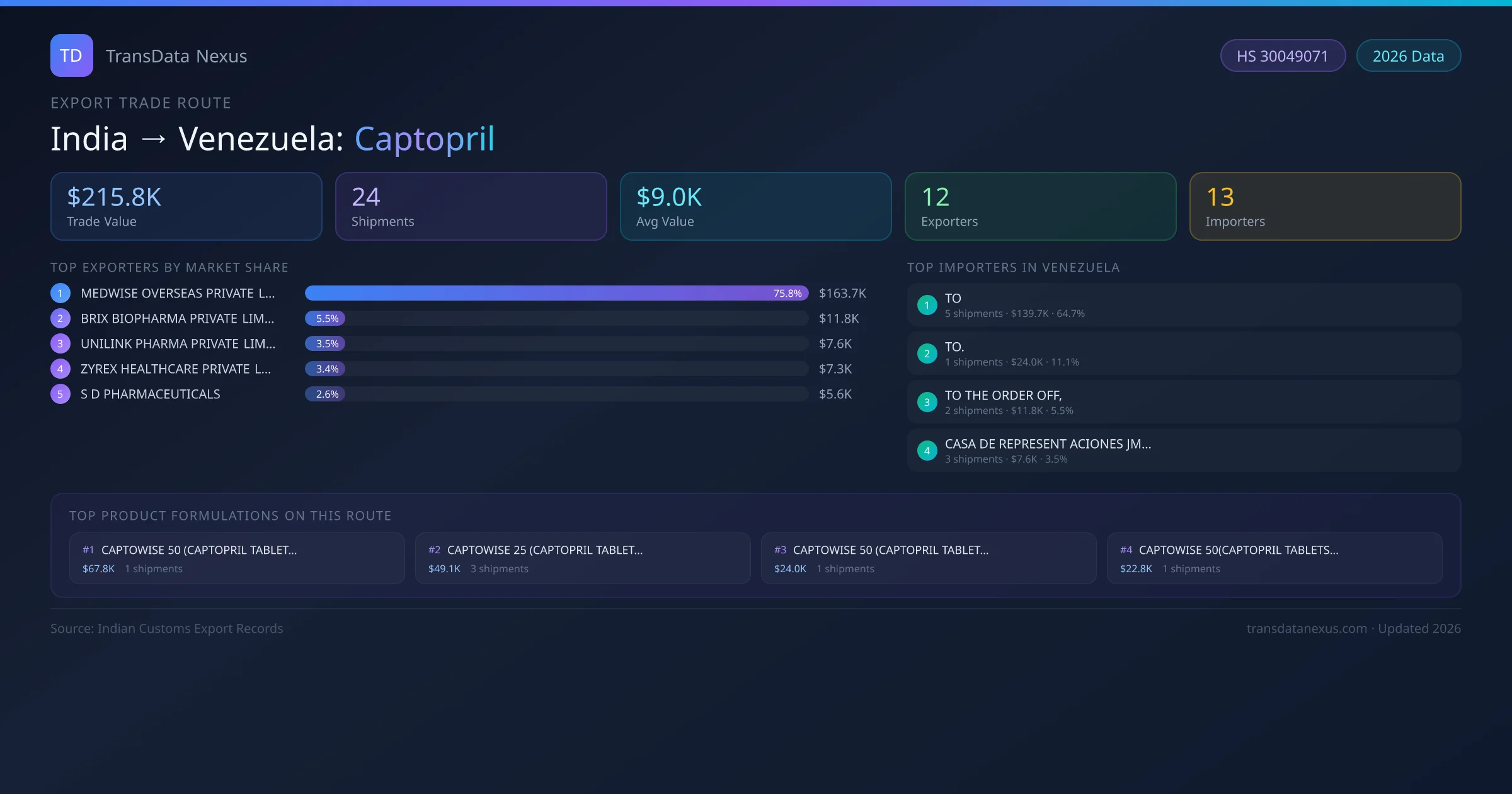 India exports Captopril to Venezuela worth approximately $215.8K USD across 24 recorded shipments. The average value per shipment is $9.0K USD.