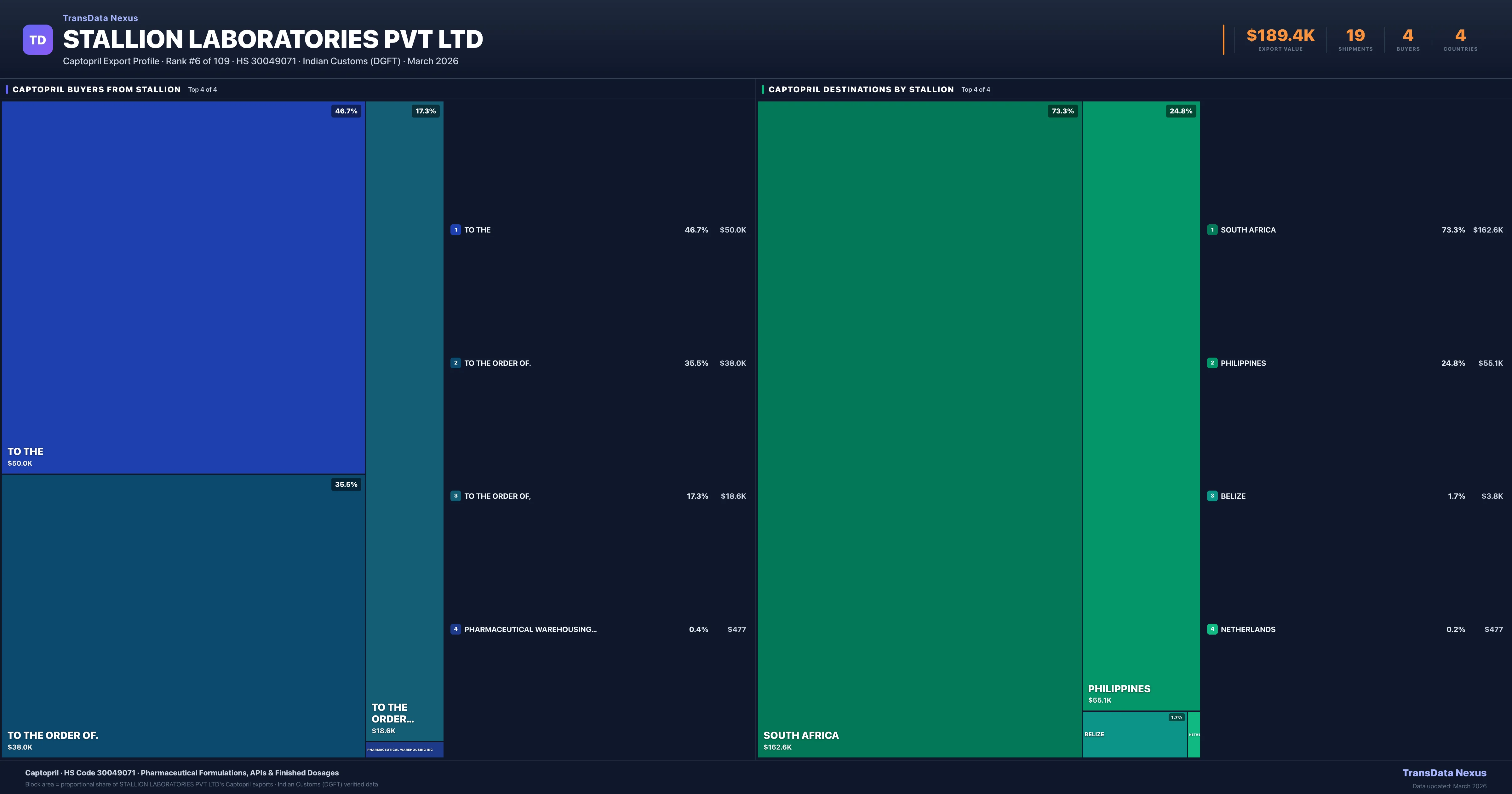 Stallion Laboratories Pvt Ltd supplies Captopril to 4 buyers globally. The largest buyer is TO THE (SOUTH AFRICA), followed by TO THE ORDER OF. (PHILIPPINES) and TO THE ORDER OF, (PHILIPPINES). These buyers represent pharmaceutical distributors, hospital groups, and government procurement agencies in their respective markets.
