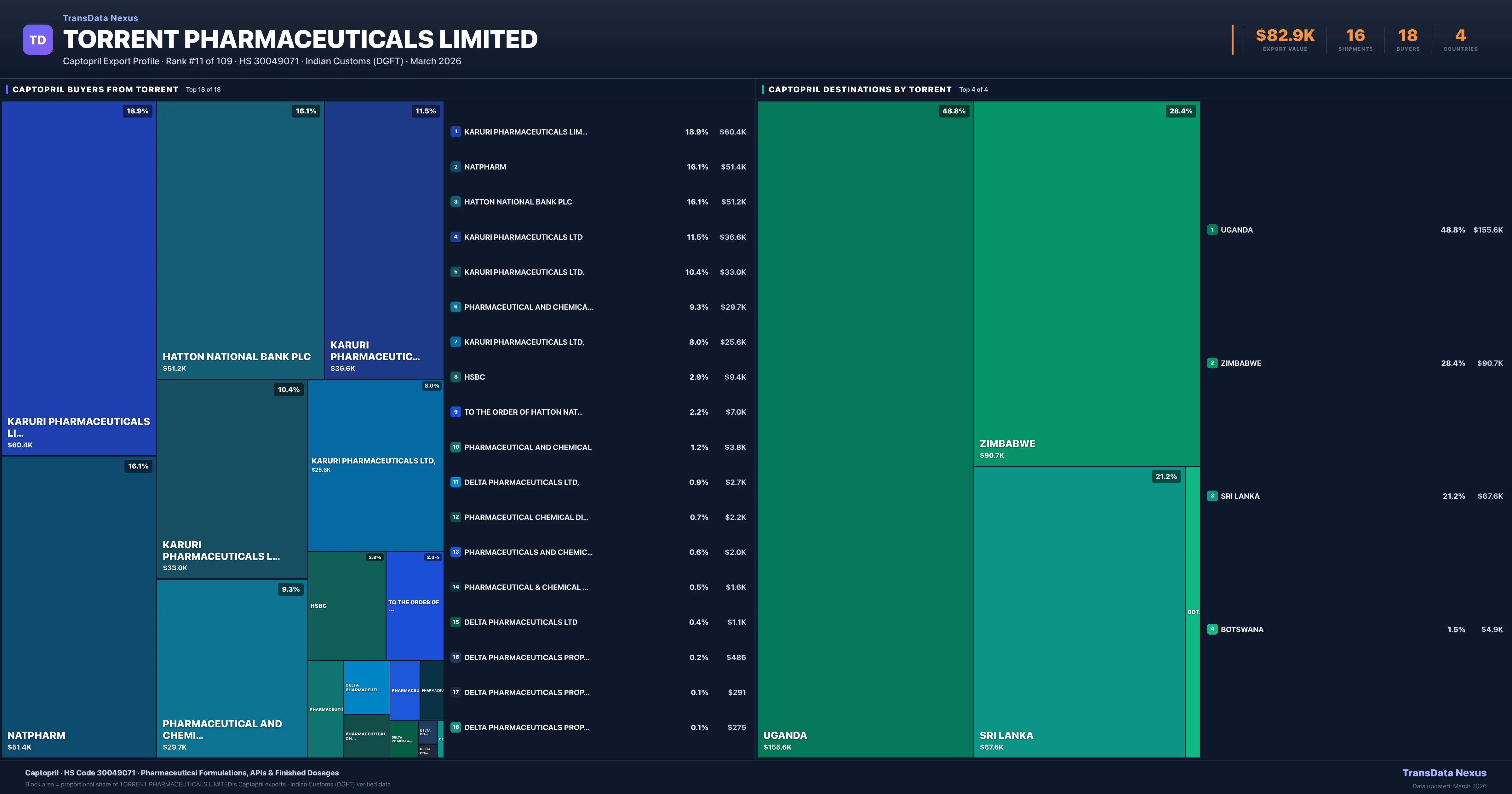 Torrent Pharmaceuticals Limited supplies Captopril to 18 buyers globally. The largest buyer is KARURI PHARMACEUTICALS LIMITED (UGANDA), followed by NATPHARM (ZIMBABWE) and HATTON NATIONAL BANK PLC (SRI LANKA). These buyers represent pharmaceutical distributors, hospital groups, and government procurement agencies in their respective markets.