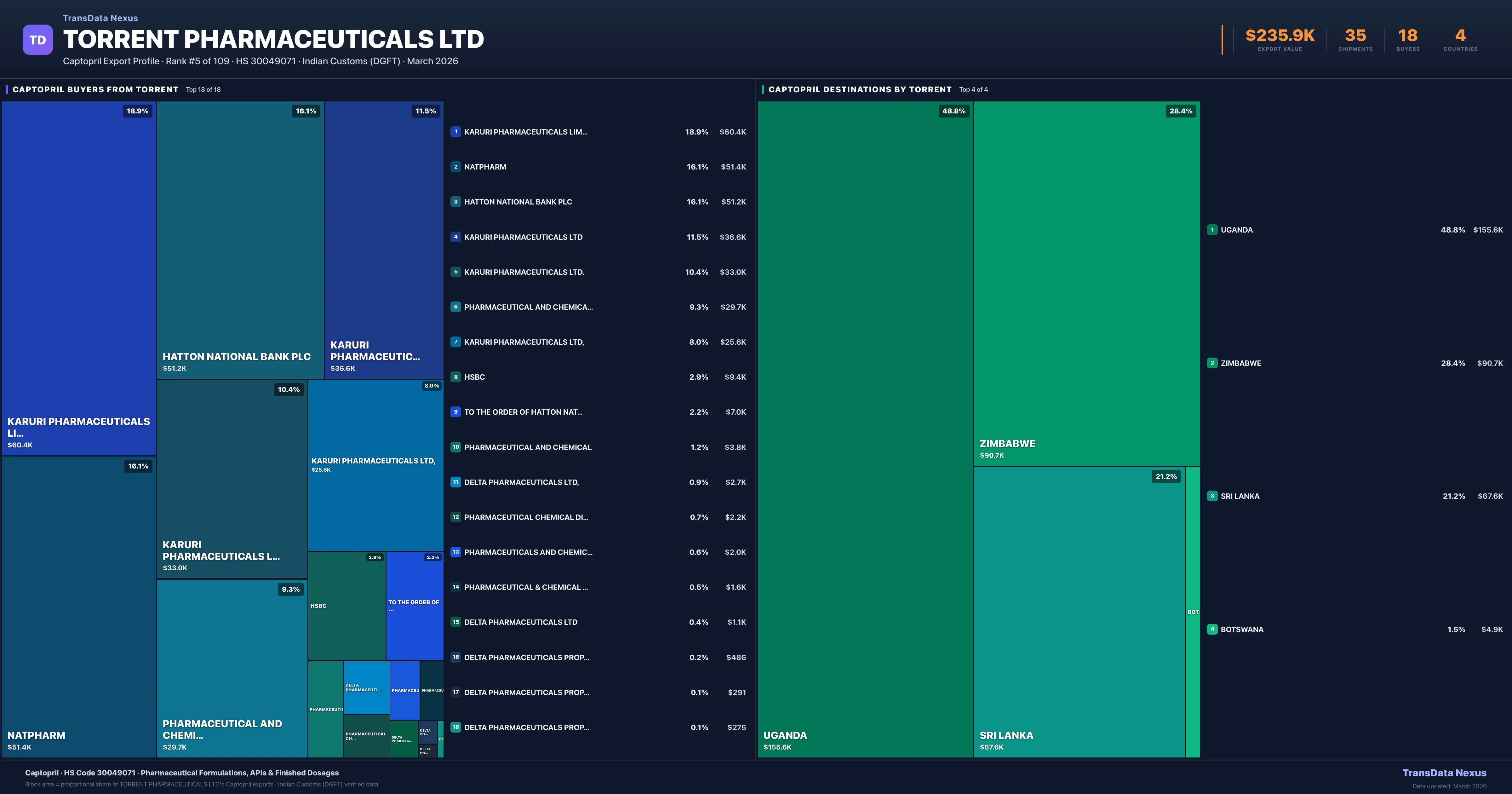Torrent Pharmaceuticals Ltd is the #5 Indian exporter of Captopril with $235.9K in export value and 35 verified shipments. Torrent Pharmaceuticals Ltd holds a 1.9% market share in Captopril exports across 4 countries.