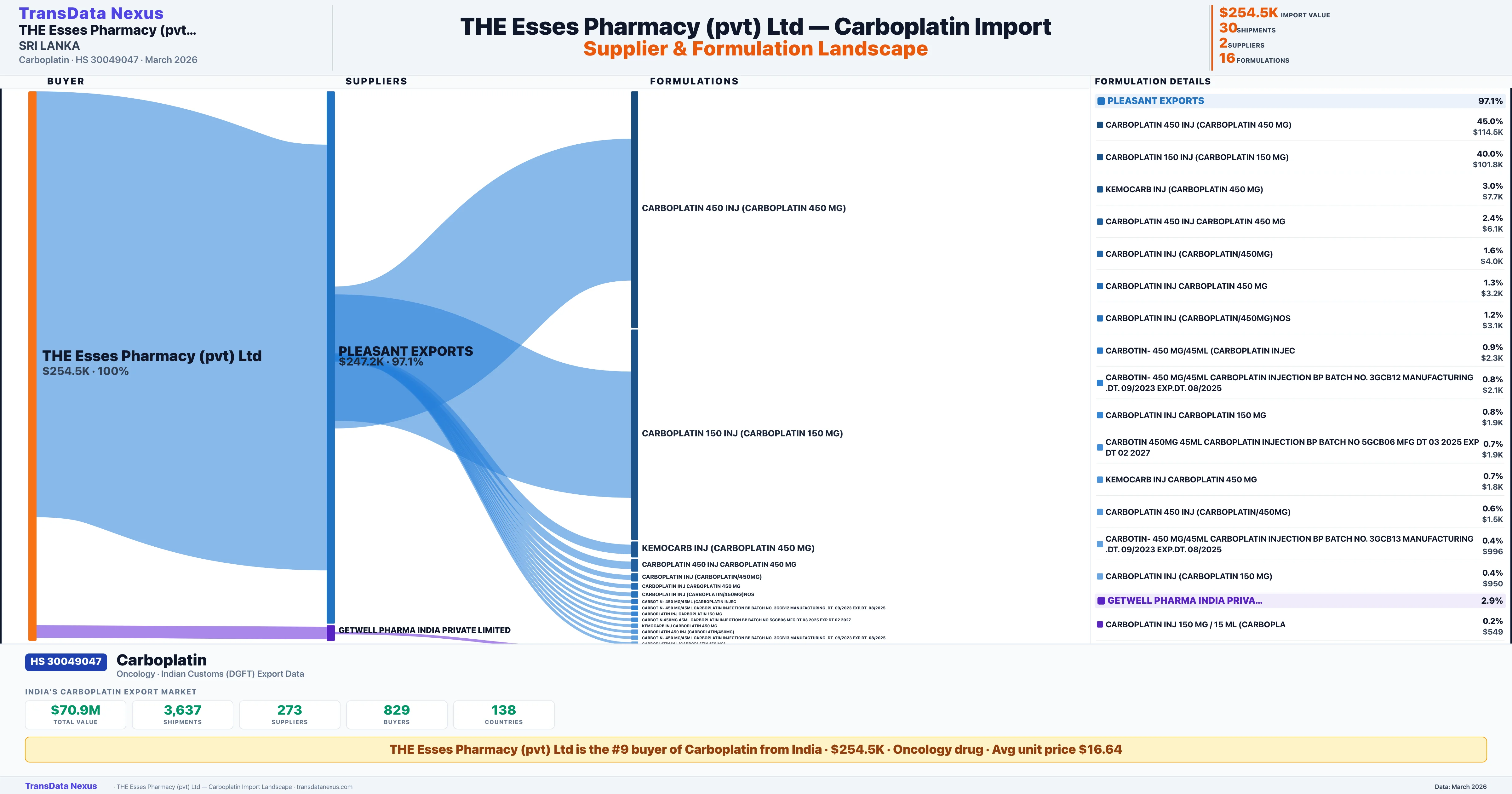 THE ESSES PHARMACY (PVT) LTD sources Carboplatin from 2 verified Indian suppliers: PLEASANT EXPORTS ($247.2K, 97.1%), GETWELL PHARMA INDIA PRIVATE LIMITED ($7.3K, 2.9%). This is based on 30 customs records.