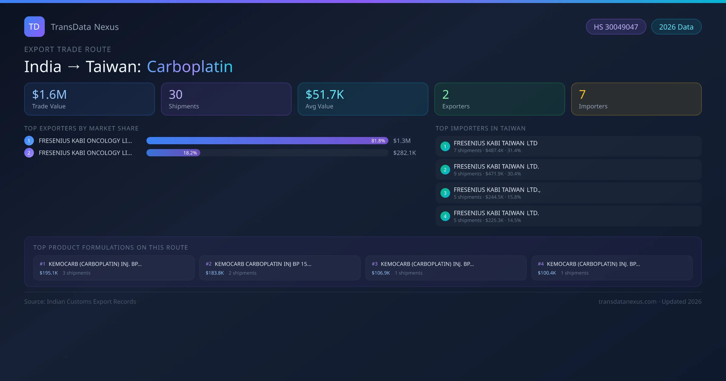 The India to Taiwan Carboplatin corridor is one of India's established pharmaceutical export routes, with 30 shipments documented worth a combined $1.6M USD. The route is dominated by FRESENIUS KABI ONCOLOGY LIMITED, which alone accounts for roughly 82% of all export value, reflecting the consolidated nature of India's carboplatin manufacturing sector.