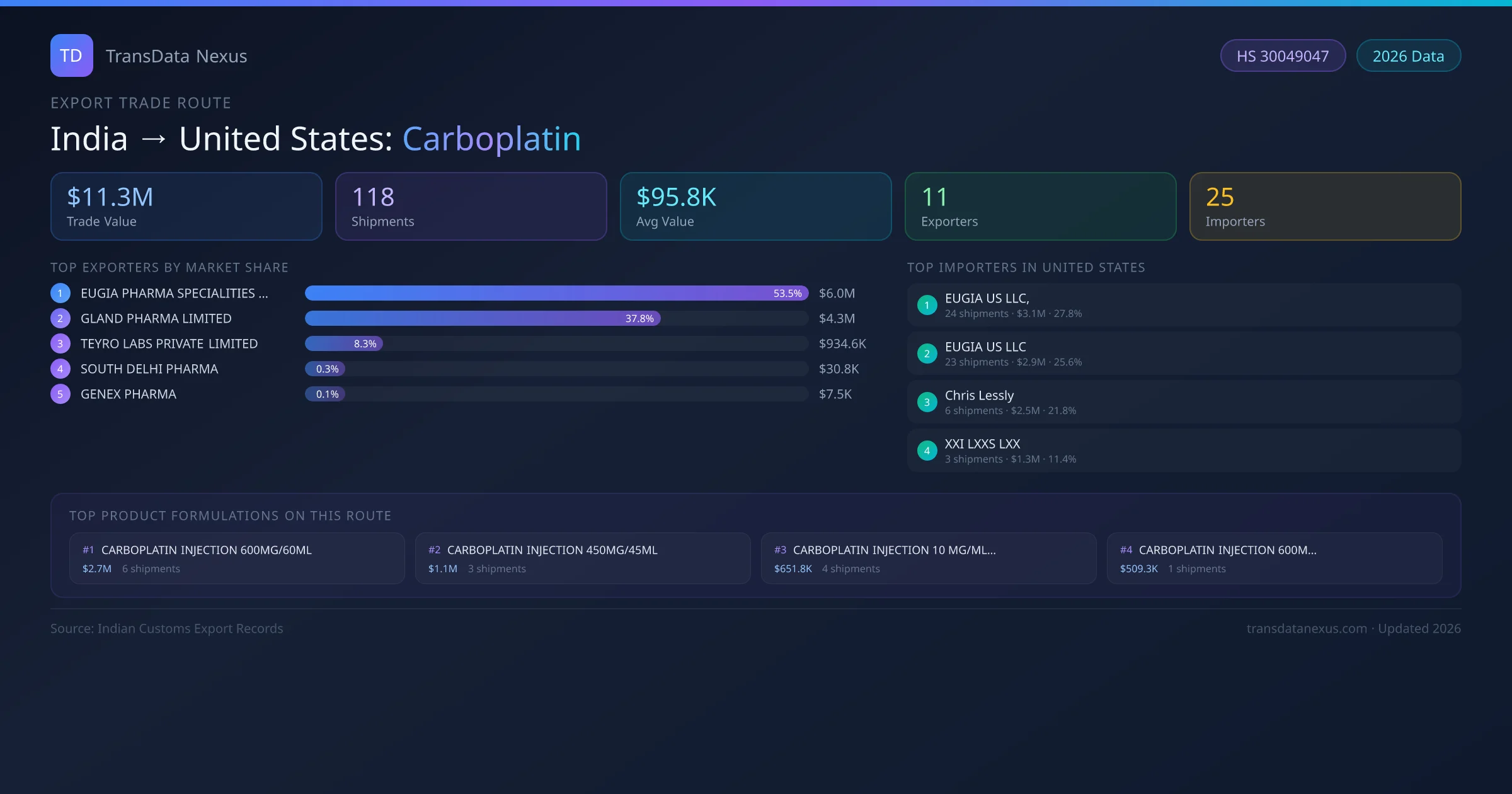 India exports Carboplatin to United States worth approximately $11.3M USD across 118 recorded shipments. The average value per shipment is $95.8K USD.