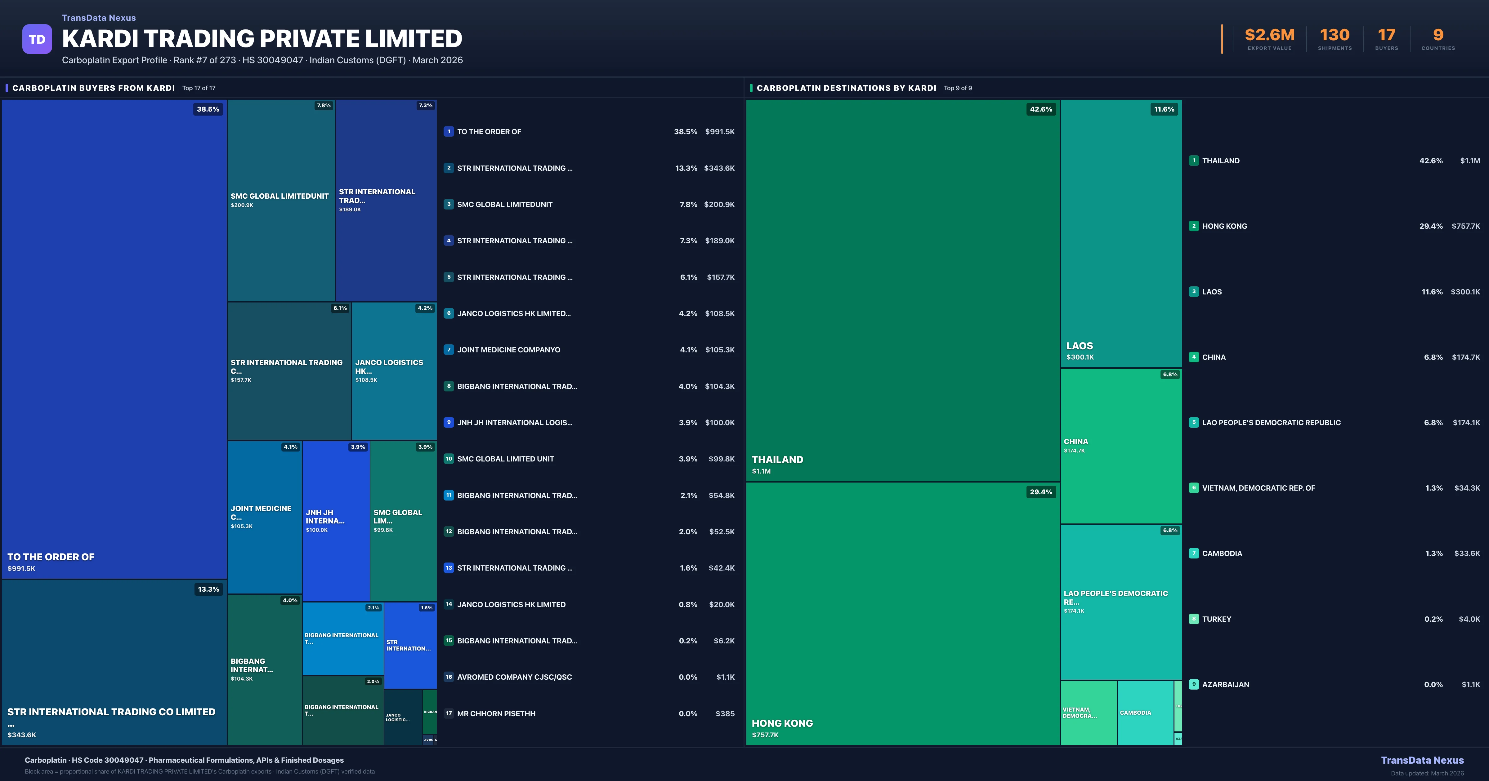 Kardi Trading Private Limited's average Carboplatin shipment value is $20.3K per consignment, based on 130 shipments totaling $2.6M. The largest destination is THAILAND (42.6% of Kardi Trading Private Limited's Carboplatin exports).