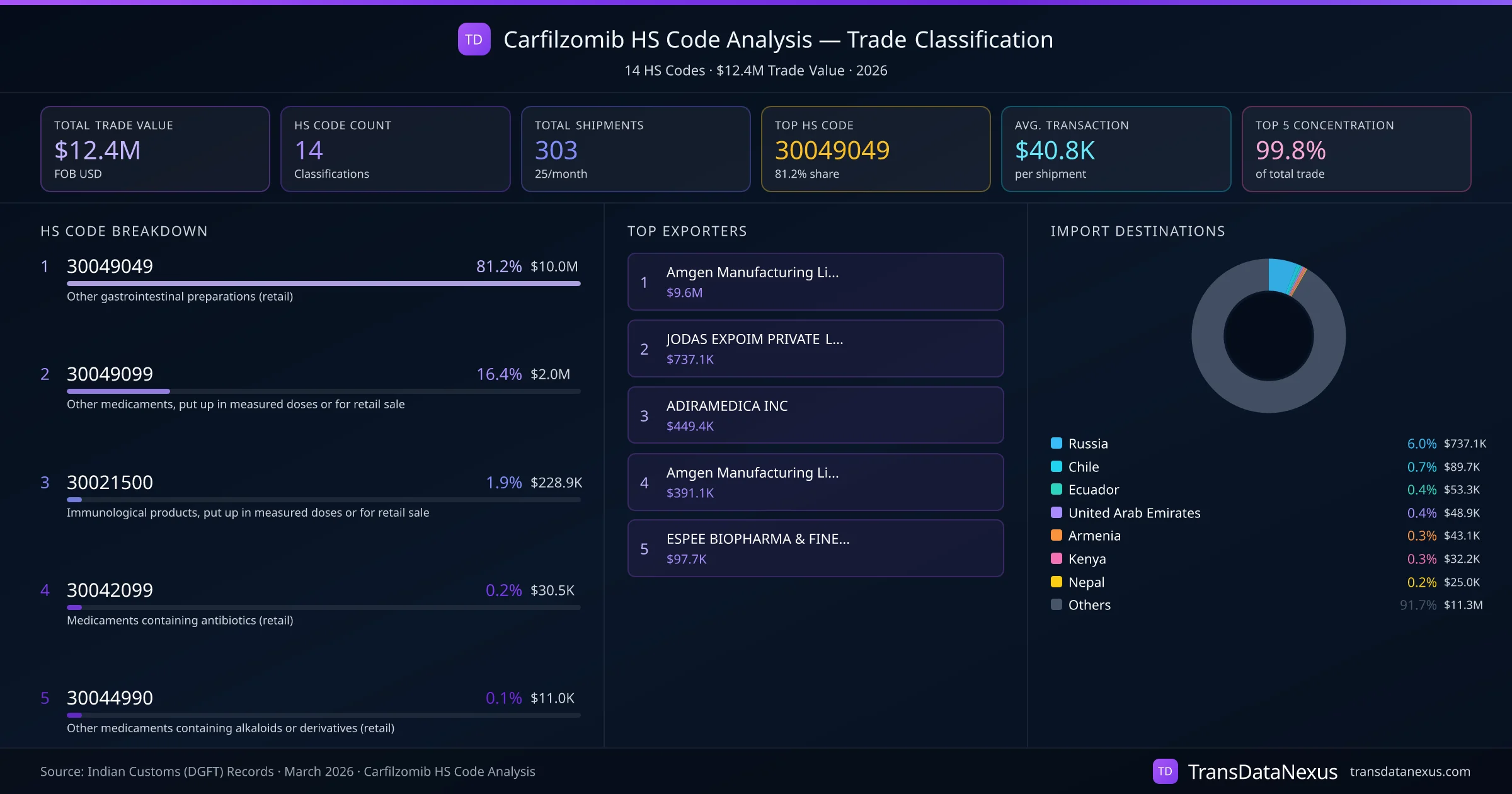 India exports Carfilzomib under 14 distinct HS code classifications, representing a total trade value of $12.4M across 303 shipments. The dominant classification is HS 30049049 (Other gastrointestinal preparations (retail)), accounting for 81.2% of all Carfilzomib trade at $10.0M. HS 30049099 (Other medicaments, put up in measured doses or for retail sale) follows at 16.4% ($2.0M). The top 5 HS codes together account for 99.8% of total Carfilzomib trade from India. The average transaction value is $40809. Key importing markets include Russia, Chile, Ecuador. Leading exporters include Amgen Manufacturing Limited and JODAS EXPOIM PRIVATE LIMITED. Data sourced from Indian Customs (DGFT) shipping bill records.