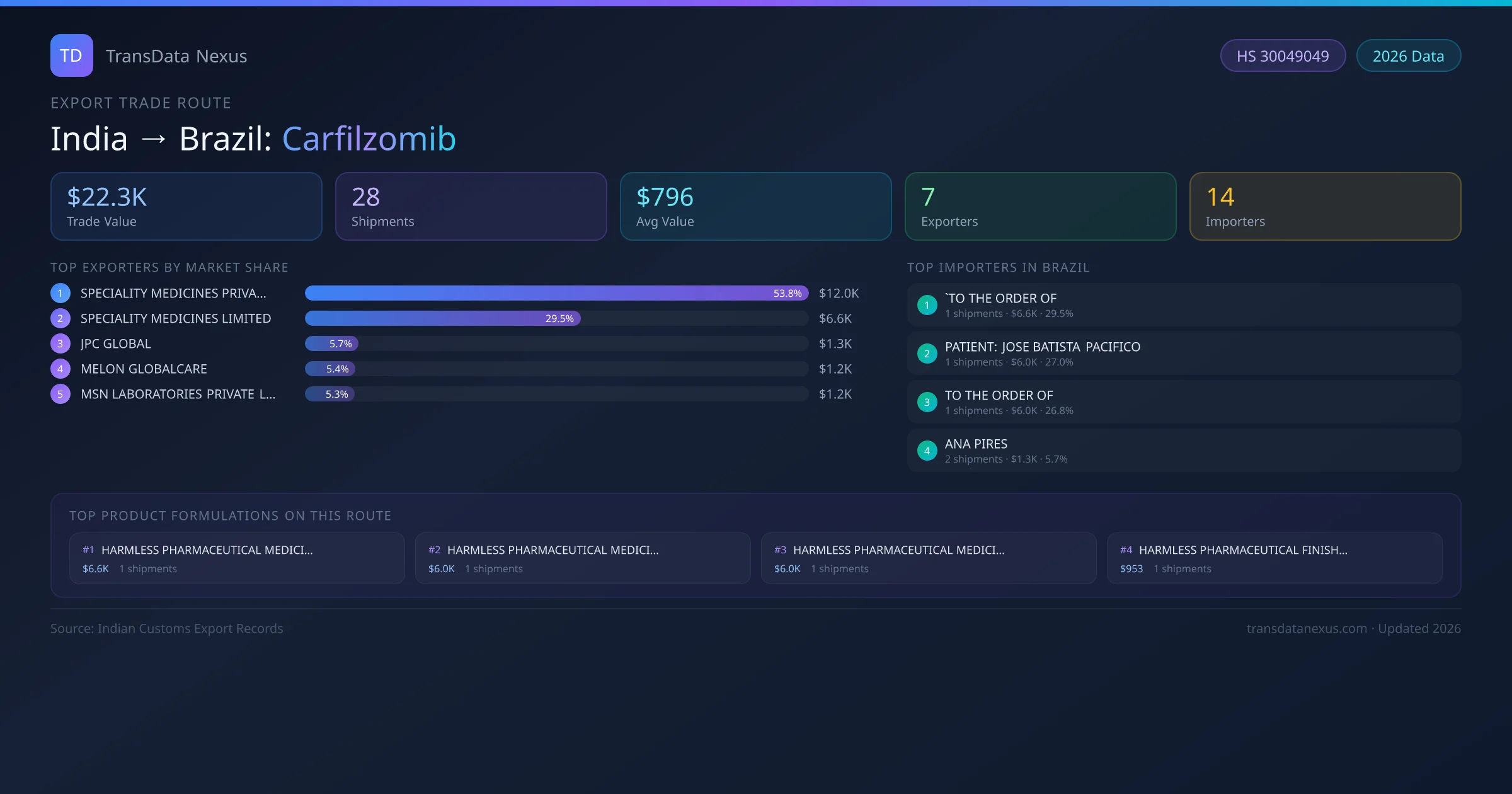 India has recorded 28 verified shipments of Carfilzomib exported to Brazil, representing a combined trade value of $22.3K USD. This corridor is served by 7 active Indian exporters, with an average shipment value of $796 USD. The leading Indian exporter is SPECIALITY MEDICINES PRIVATE LIMITED, which accounts for 54% of total export value with 2 shipments worth $12.0K USD. On the buying side, `TO THE ORDER OF is the largest importer in Brazil with $6.6K USD in purchases. The top 3 suppliers — SPECIALITY MEDICINES PRIVATE LIMITED, SPECIALITY MEDICINES LIMITED, JPC GLOBAL — together control 89% of total trade value on this route. All data sourced from Indian Customs (DGFT) shipping bill records. Values reported in FOB USD.