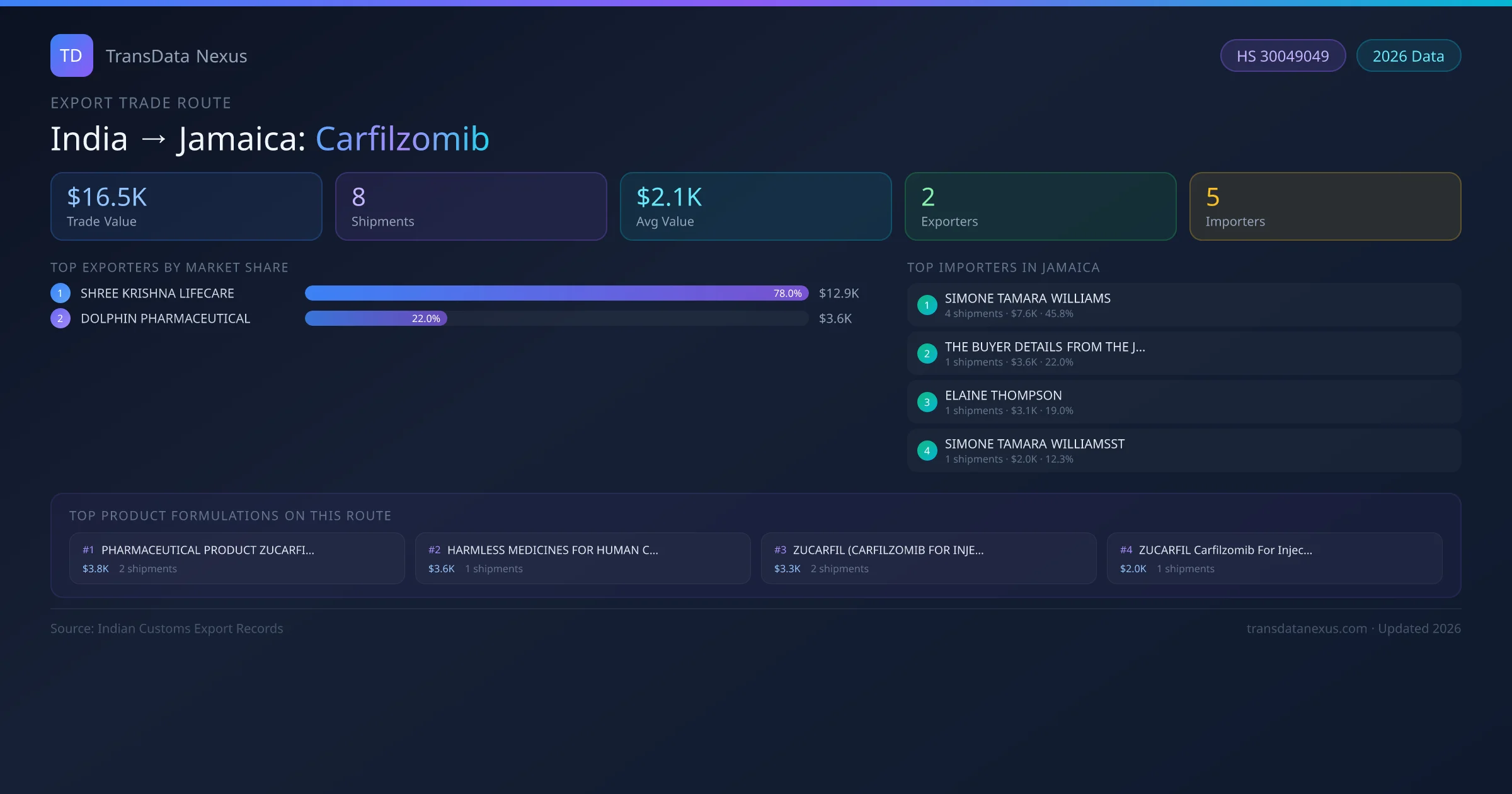 On the import side, key buyers of Indian carfilzomib in Jamaica include SIMONE TAMARA WILLIAMS, THE BUYER DETAILS FROM THE JAMAICA, ELAINE THOMPSON and 2 others. SIMONE TAMARA WILLIAMS is the single largest importer with 4 shipments valued at $7.6K USD.