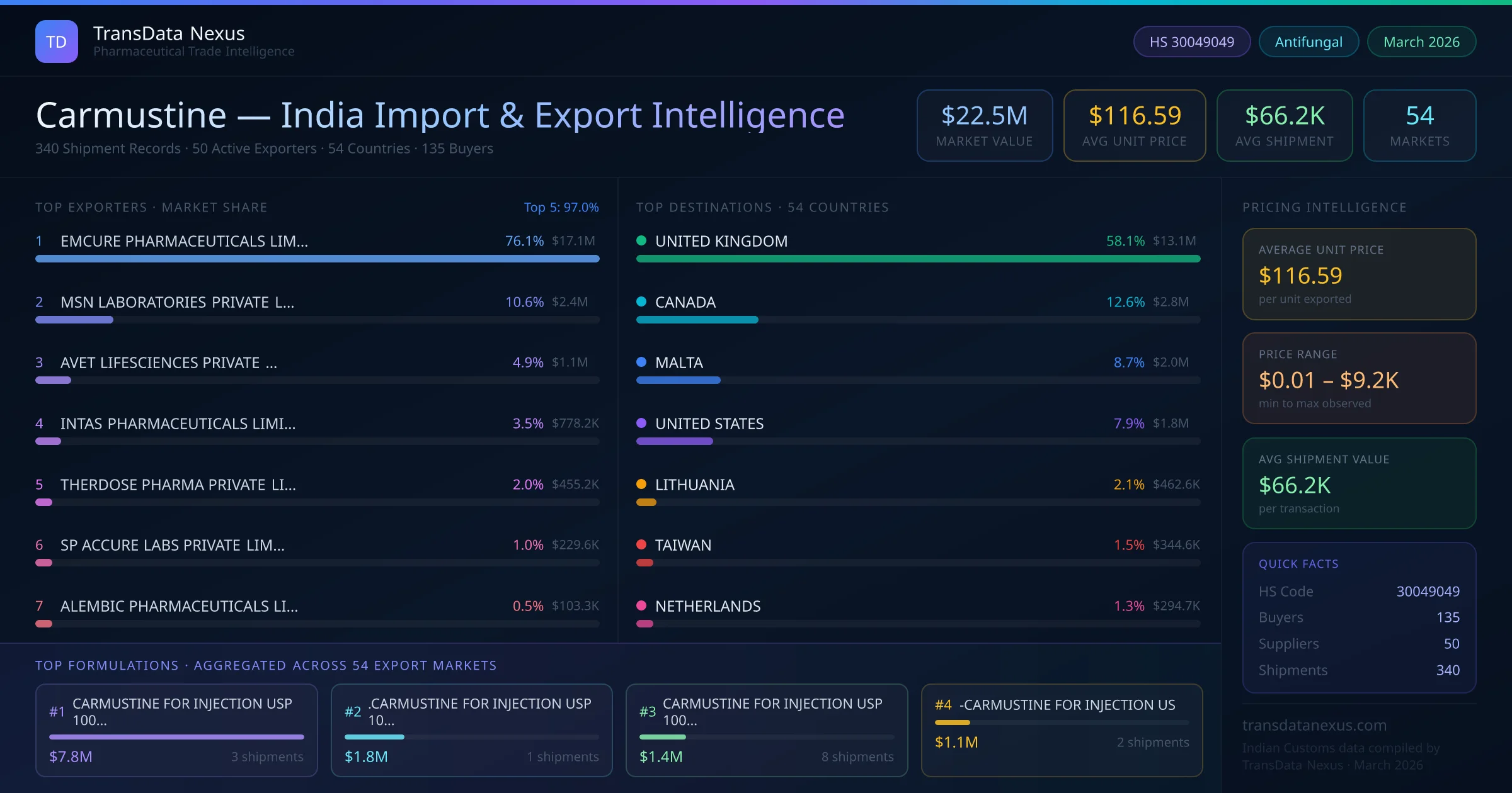 Between 2022 and 2026, India exported $22.5M worth of carmustine across 340 verified shipments to 54 countries — covering 28% of world markets in the Advanced Oncology segment. The largest destination is UNITED KINGDOM (58.1%). EMCURE PHARMACEUTICALS LIMITED leads with a 76.1% share. All figures are drawn from Indian Customs (DGFT) shipping bill records spanning four years of trade activity.