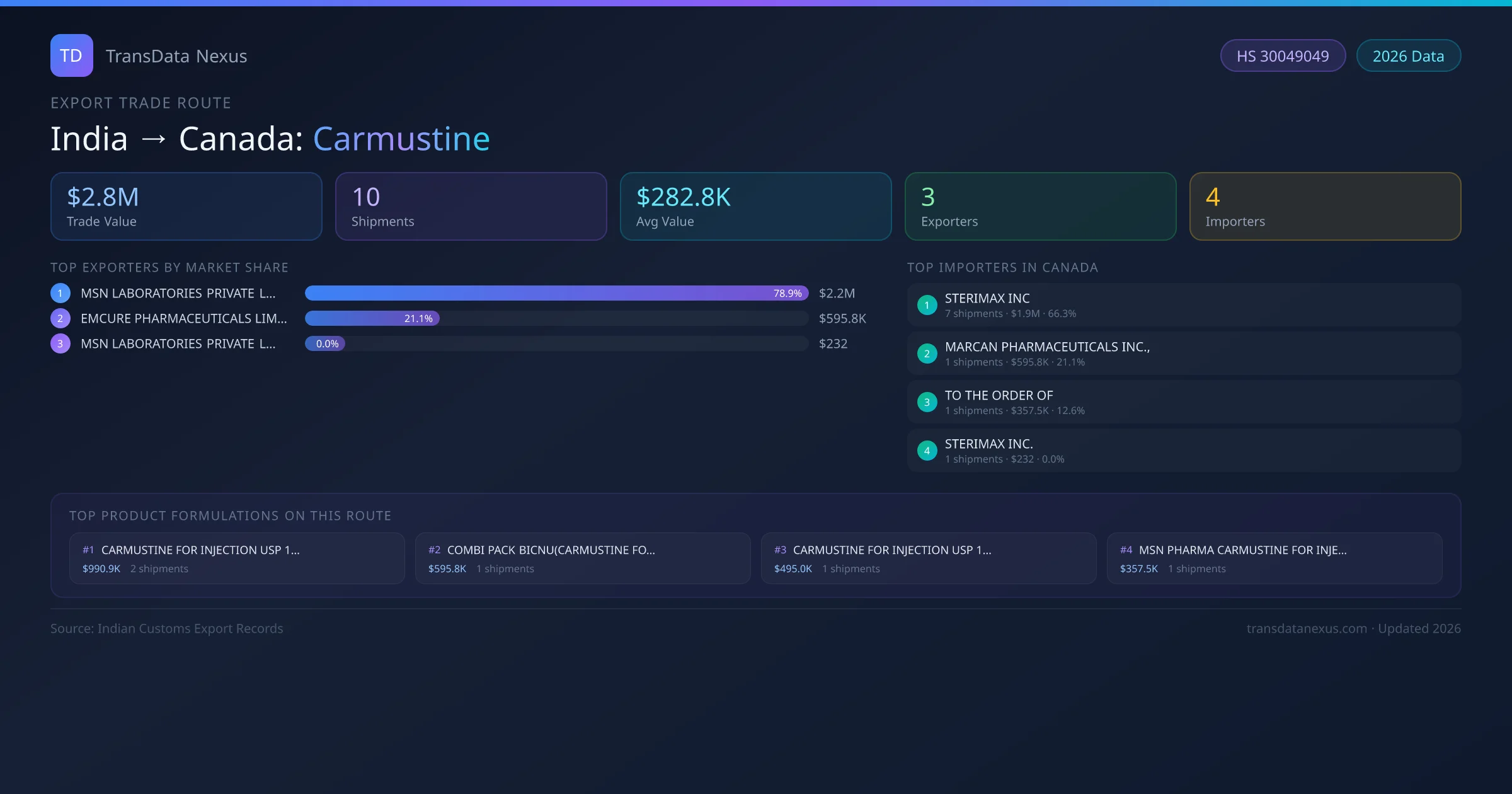 India exports Carmustine to Canada worth approximately $2.8M USD across 10 recorded shipments. The average value per shipment is $282.8K USD.
