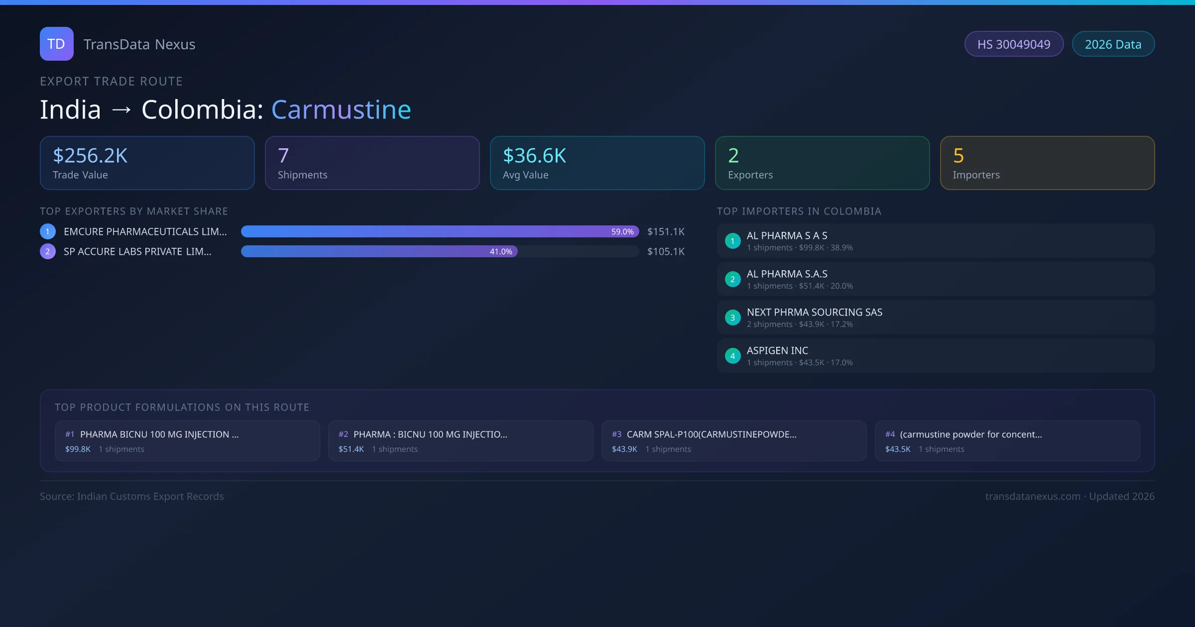 India has recorded 7 verified shipments of Carmustine exported to Colombia, representing a combined trade value of $256.2K USD. This corridor is served by 2 active Indian exporters, with an average shipment value of $36.6K USD. The leading Indian exporter is EMCURE PHARMACEUTICALS LIMITED, which accounts for 59% of total export value with 2 shipments worth $151.1K USD. On the buying side, AL PHARMA S A S is the largest importer in Colombia with $99.8K USD in purchases. All data sourced from Indian Customs (DGFT) shipping bill records. Values reported in FOB USD.