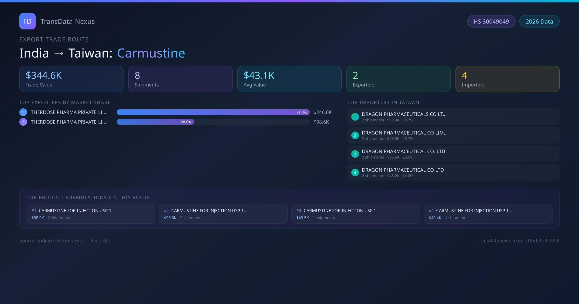 The India to Taiwan Carmustine corridor is one of India's established pharmaceutical export routes, with 8 shipments documented worth a combined $344.6K USD. The route is dominated by THERDOSE PHARMA PRIVATE LIMITED, which alone accounts for roughly 71% of all export value, reflecting the consolidated nature of India's carmustine manufacturing sector.