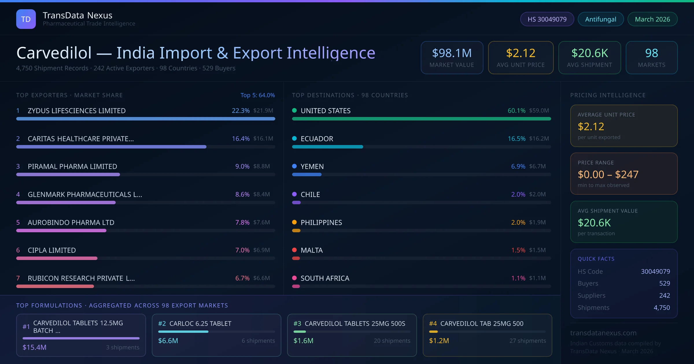 The total export value of carvedilol from India is $98.1M, recorded across 4,750 shipments from 242 active exporters to 98 countries. The average shipment value is $20.6K.
