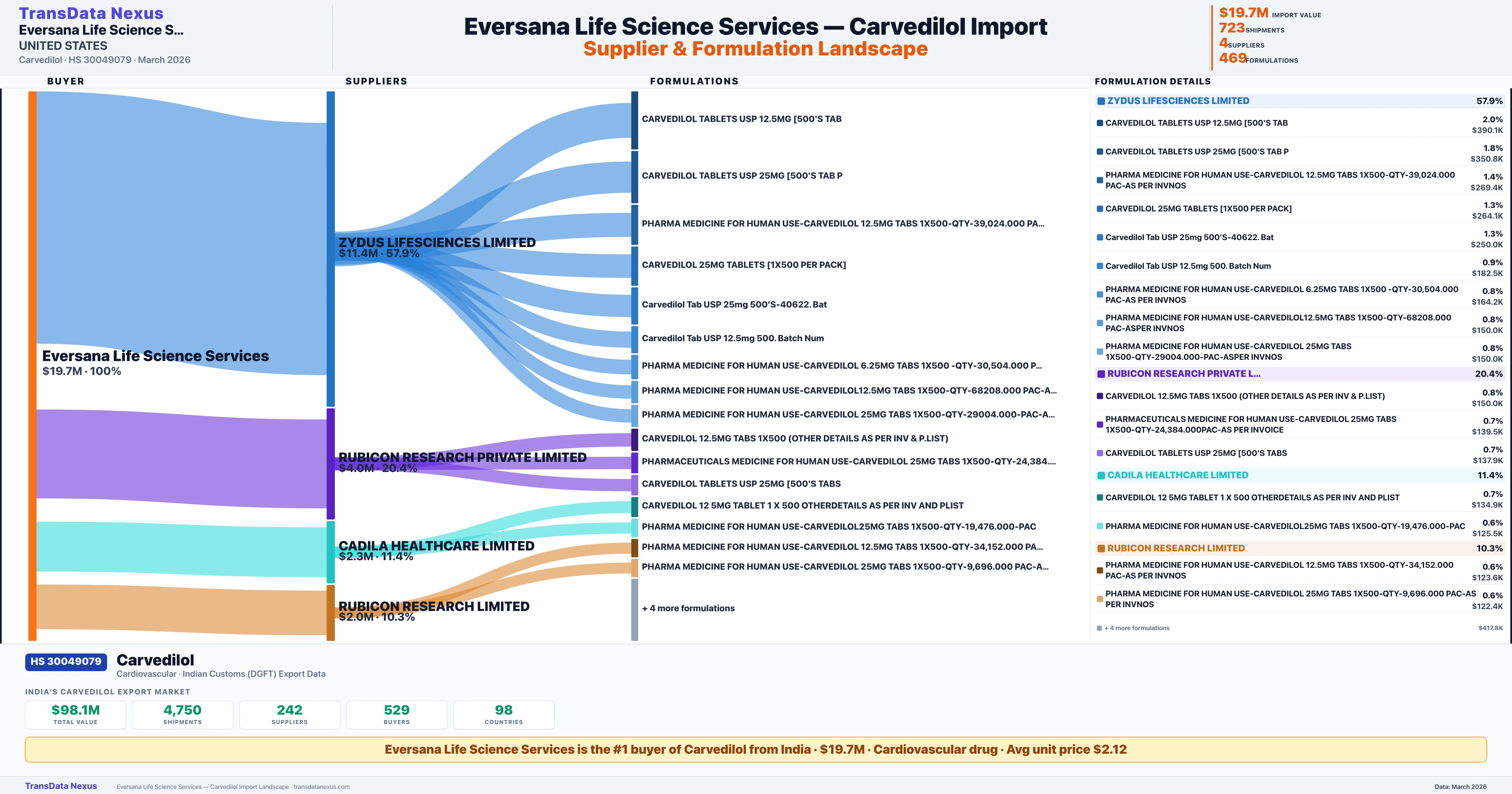 EVERSANA LIFE SCIENCE SERVICES sources Carvedilol from 4 verified Indian suppliers: ZYDUS LIFESCIENCES LIMITED ($11.4M, 57.9%), RUBICON RESEARCH PRIVATE LIMITED ($4.0M, 20.4%), CADILA HEALTHCARE LIMITED ($2.3M, 11.4%), RUBICON RESEARCH LIMITED ($2.0M, 10.3%). This is based on 723 customs records.