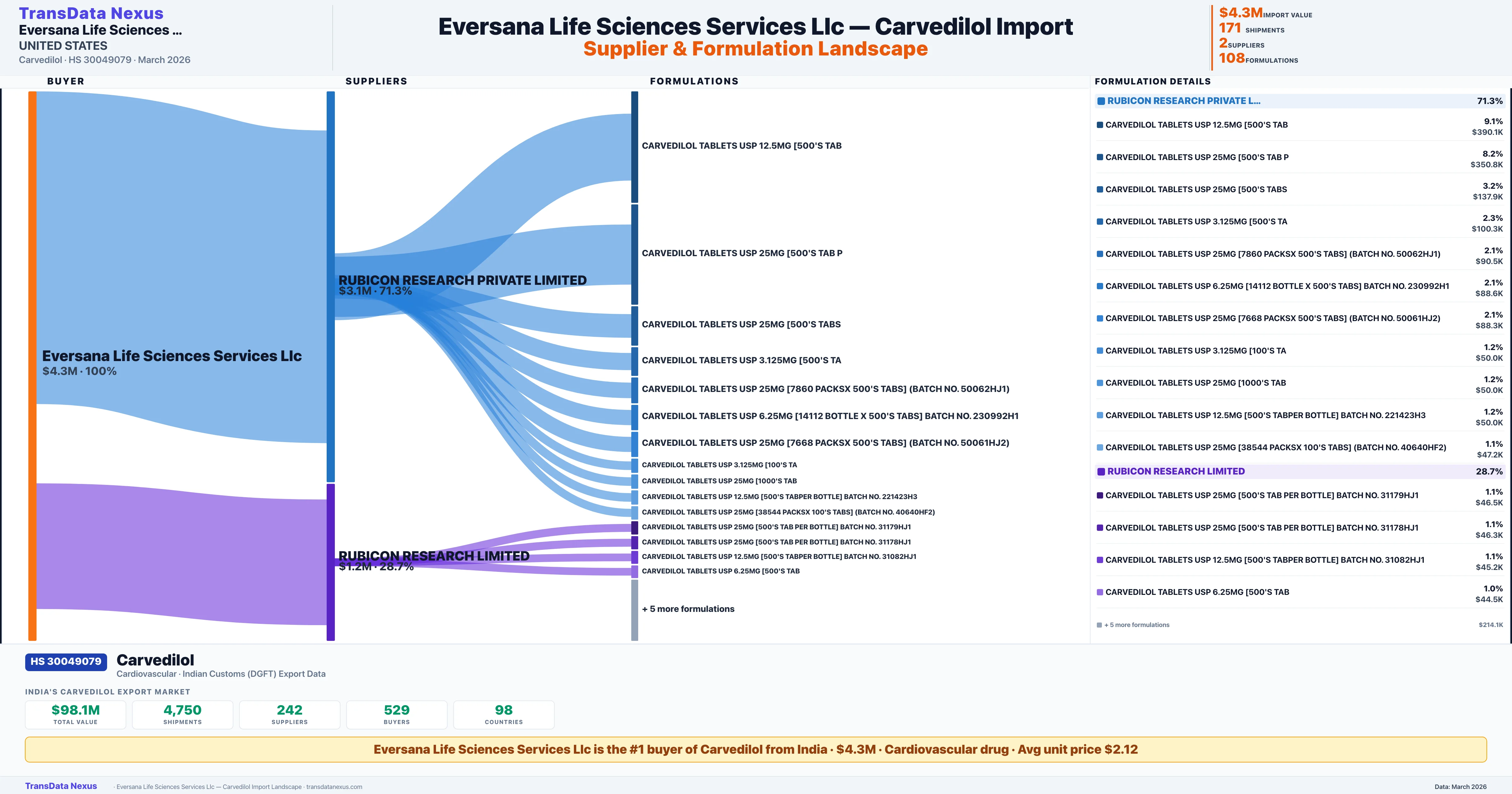 EVERSANA LIFE SCIENCES SERVICES LLC sources Carvedilol from 2 verified Indian suppliers based on 171 customs records. The primary supplier is RUBICON RESEARCH PRIVATE LIMITED accounting for 71.3% of imports.