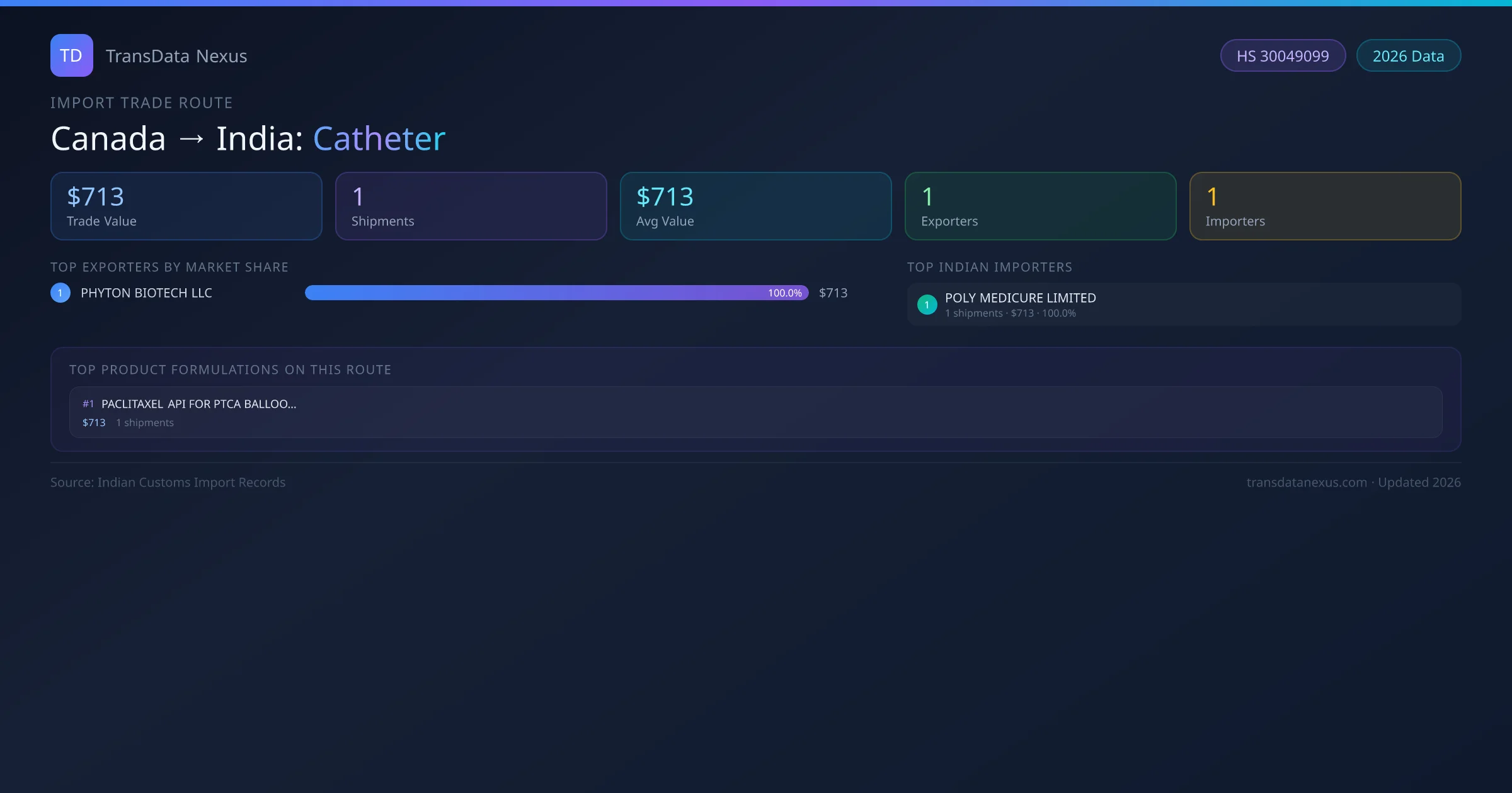 India has recorded 1 verified shipments of Catheter imported from Canada, representing a combined trade value of $713 USD. This corridor is served by 1 active Canada exporters, with an average shipment value of $713 USD. The leading Canada supplier is PHYTON BIOTECH LLC, which accounts for 100% of total import value with 1 shipments worth $713 USD. On the buying side, POLY MEDICURE LIMITED is the largest Indian importer with $713 USD in purchases. All data sourced from Indian Customs (DGFT) shipping bill of entry records. Values reported in FOB USD.