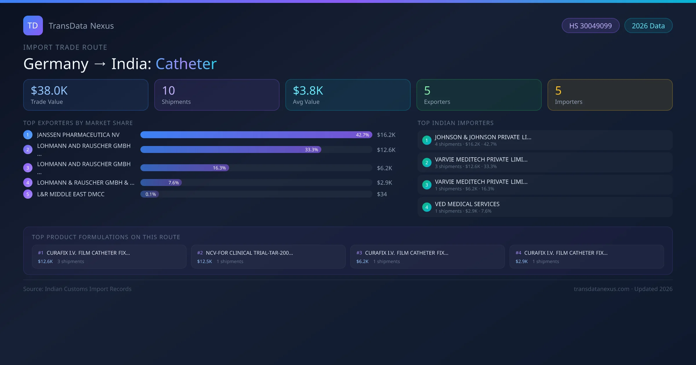 India has recorded 10 verified shipments of Catheter imported from Germany, representing a combined trade value of $38.0K USD. This corridor is served by 5 active Germany exporters, with an average shipment value of $3.8K USD. The leading Germany supplier is JANSSEN PHARMACEUTICA NV , which accounts for 43% of total import value with 4 shipments worth $16.2K USD. On the buying side, JOHNSON & JOHNSON PRIVATE LIMITED is the largest Indian importer with $16.2K USD in purchases. The top 3 suppliers — JANSSEN PHARMACEUTICA NV , LOHMANN AND RAUSCHER GMBH AND CO. KG, LOHMANN AND RAUSCHER GMBH AND CO. KG — together control 92% of total trade value on this route. All data sourced from Indian Customs (DGFT) shipping bill of entry records. Values reported in FOB USD.