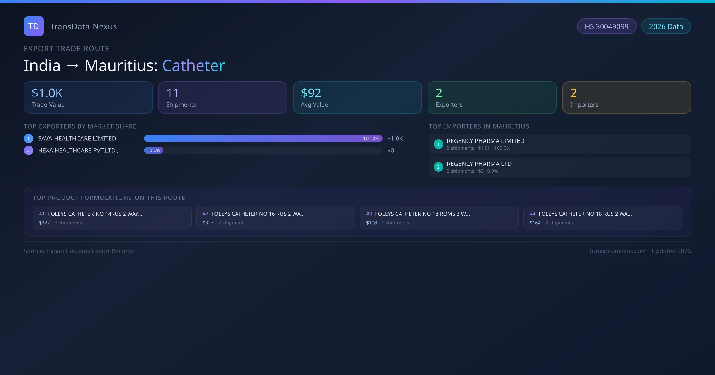 The India to Mauritius Catheter corridor is one of India's established pharmaceutical export routes, with 11 shipments documented worth a combined $1.0K USD. The route is dominated by SAVA HEALTHCARE LIMITED, which alone accounts for roughly 100% of all export value, reflecting the consolidated nature of India's catheter manufacturing sector.