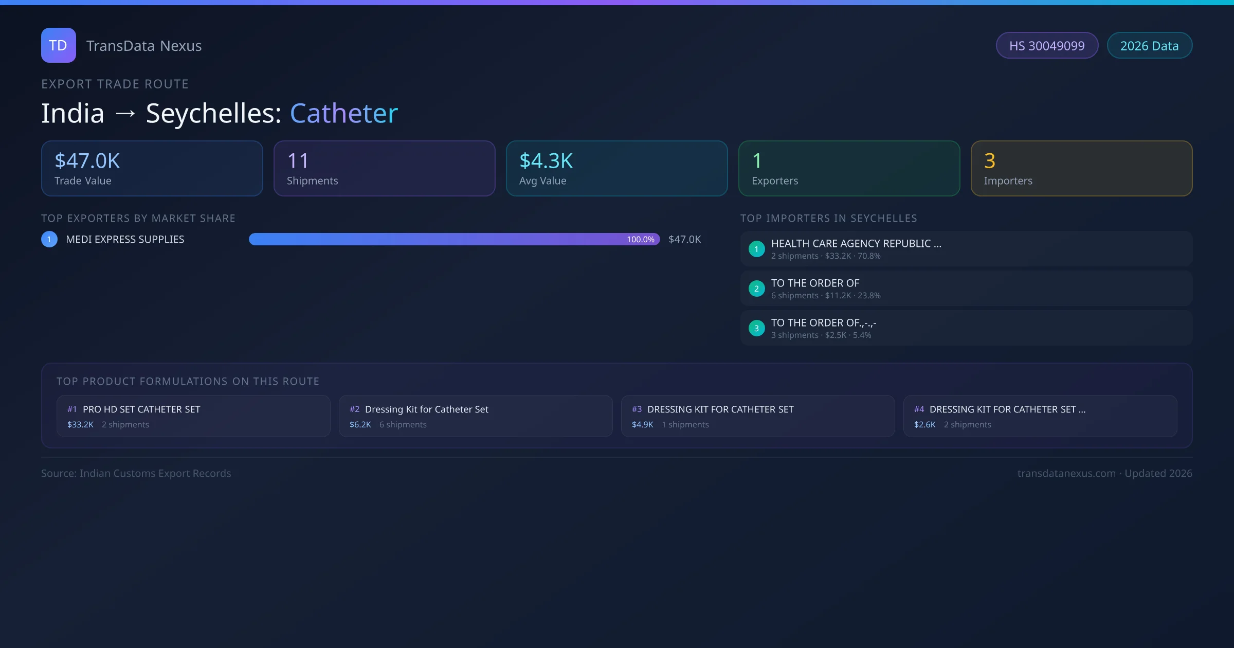 The India to Seychelles Catheter corridor is one of India's established pharmaceutical export routes, with 11 shipments documented worth a combined $47.0K USD. The route is dominated by MEDI EXPRESS SUPPLIES, which alone accounts for roughly 100% of all export value, reflecting the consolidated nature of India's catheter manufacturing sector.