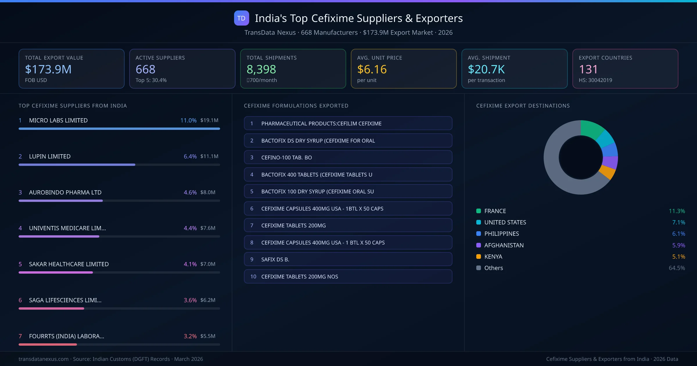 Who Exports Cefixime from India โ 668 Suppliers Behind a $173.9M Market
