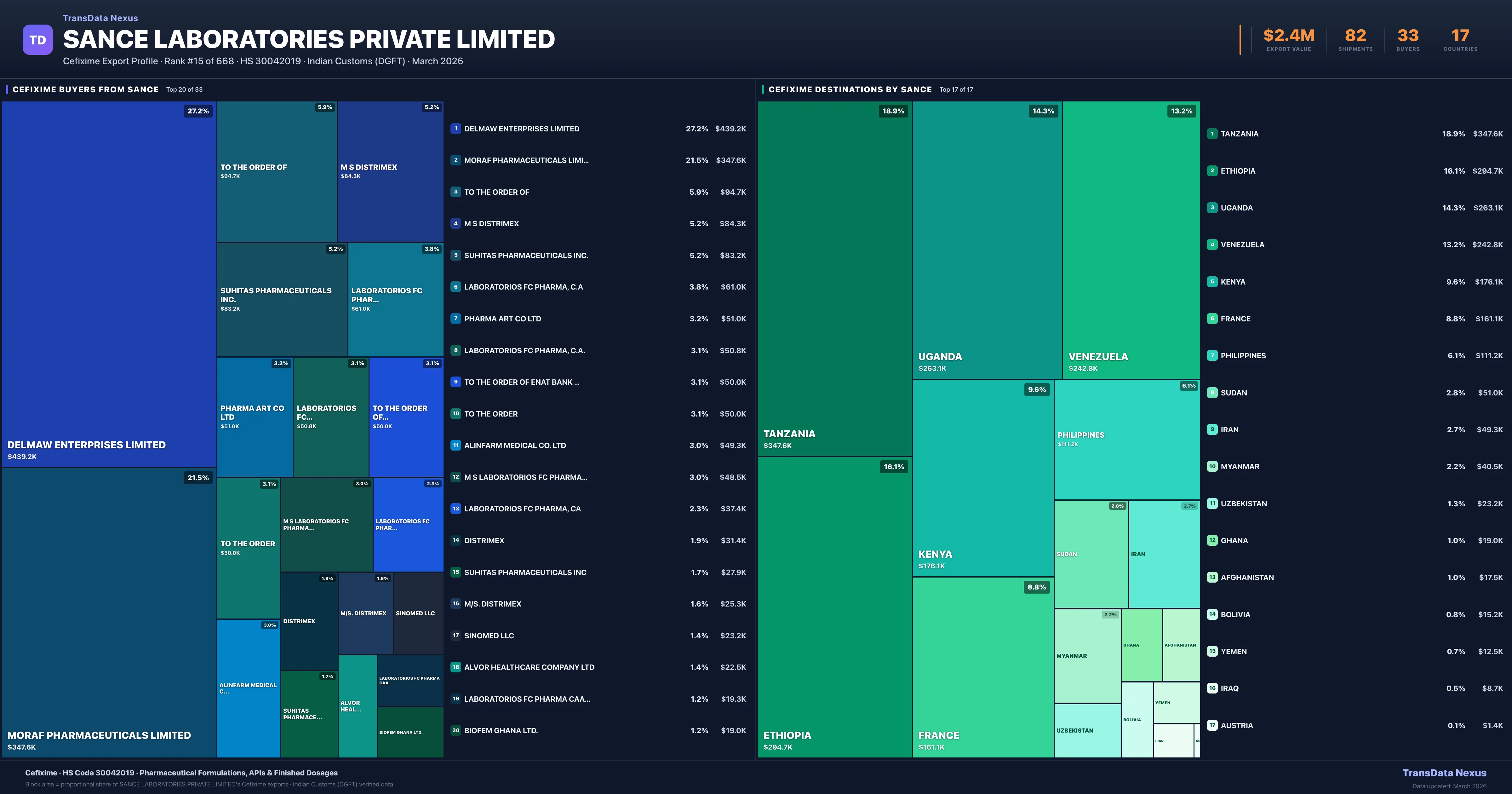 Sance Laboratories Private Limited supplies Cefixime to 33 buyers globally. The largest buyer is DELMAW ENTERPRISES LIMITED (UGANDA), followed by MORAF PHARMACEUTICALS LIMITED (TANZANIA) and TO THE ORDER OF (ETHIOPIA). These buyers represent pharmaceutical distributors, hospital groups, and government procurement agencies in their respective markets.