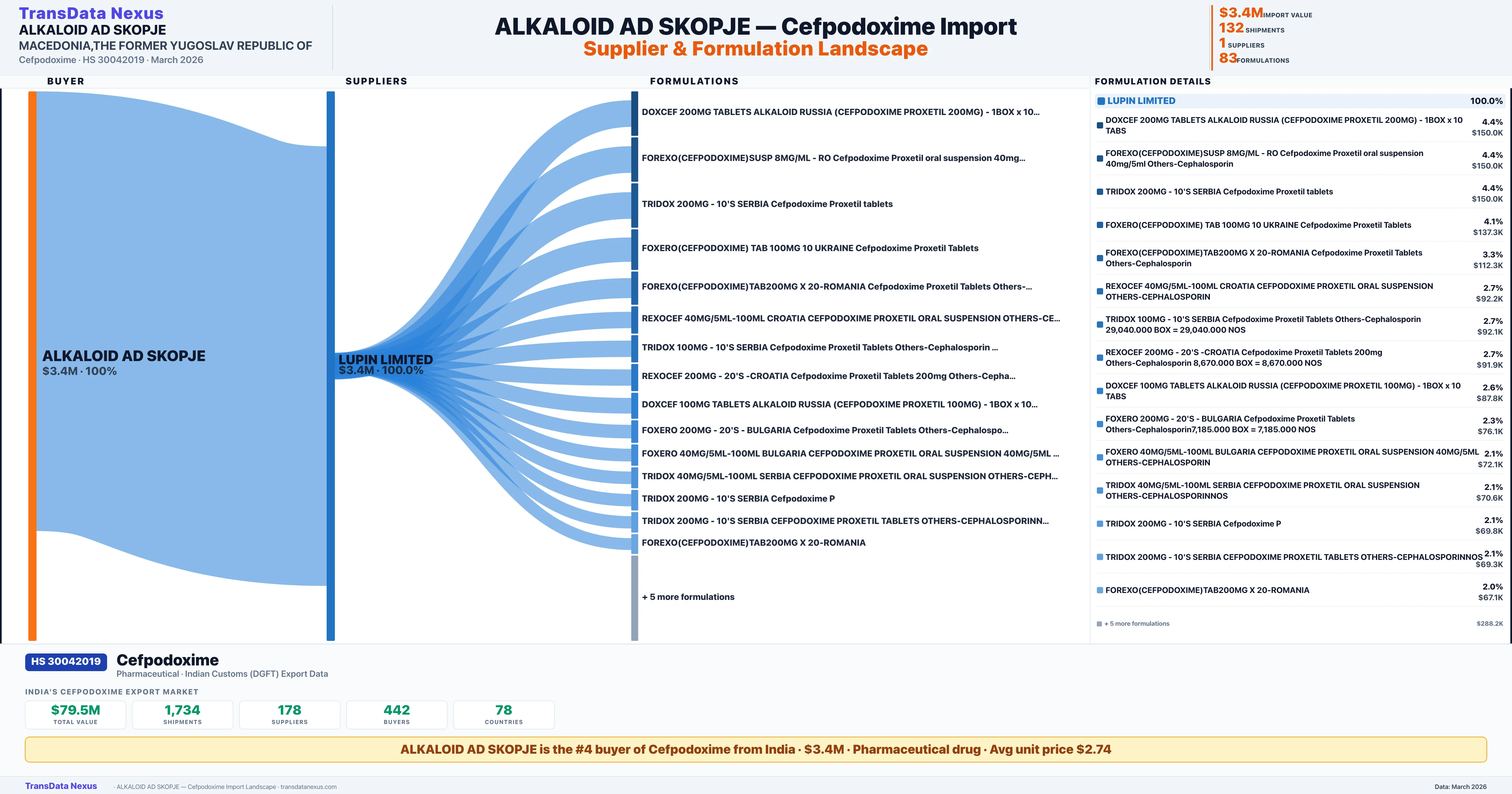 ALKALOID AD SKOPJE sources Cefpodoxime from 1 verified Indian supplier: LUPIN LIMITED ($3.4M, 100.0%). This is based on 132 customs records.