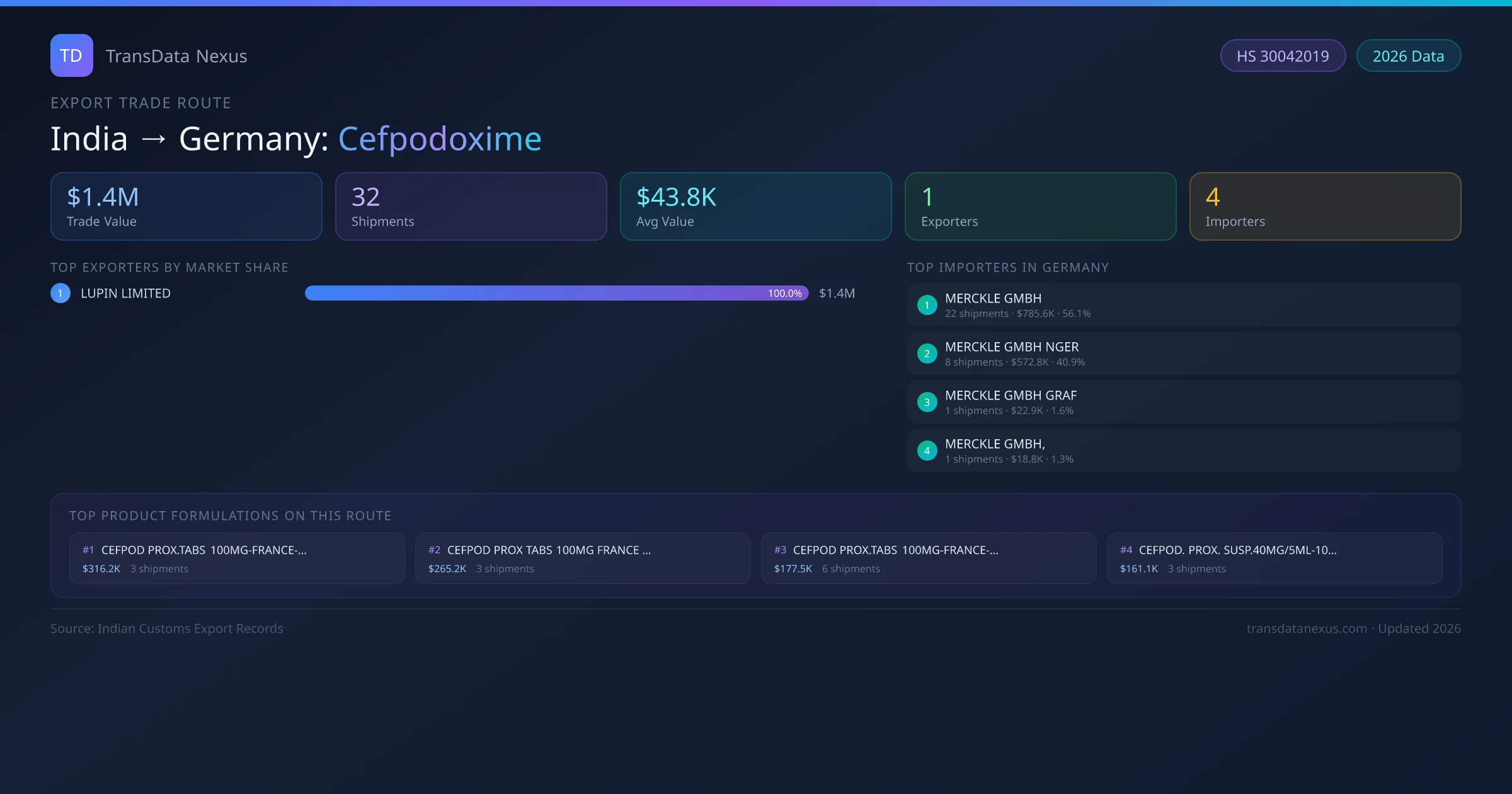 The India to Germany Cefpodoxime corridor is one of India's established pharmaceutical export routes, with 32 shipments documented worth a combined $1.4M USD. The route is dominated by LUPIN LIMITED, which alone accounts for roughly 100% of all export value, reflecting the consolidated nature of India's cefpodoxime manufacturing sector.