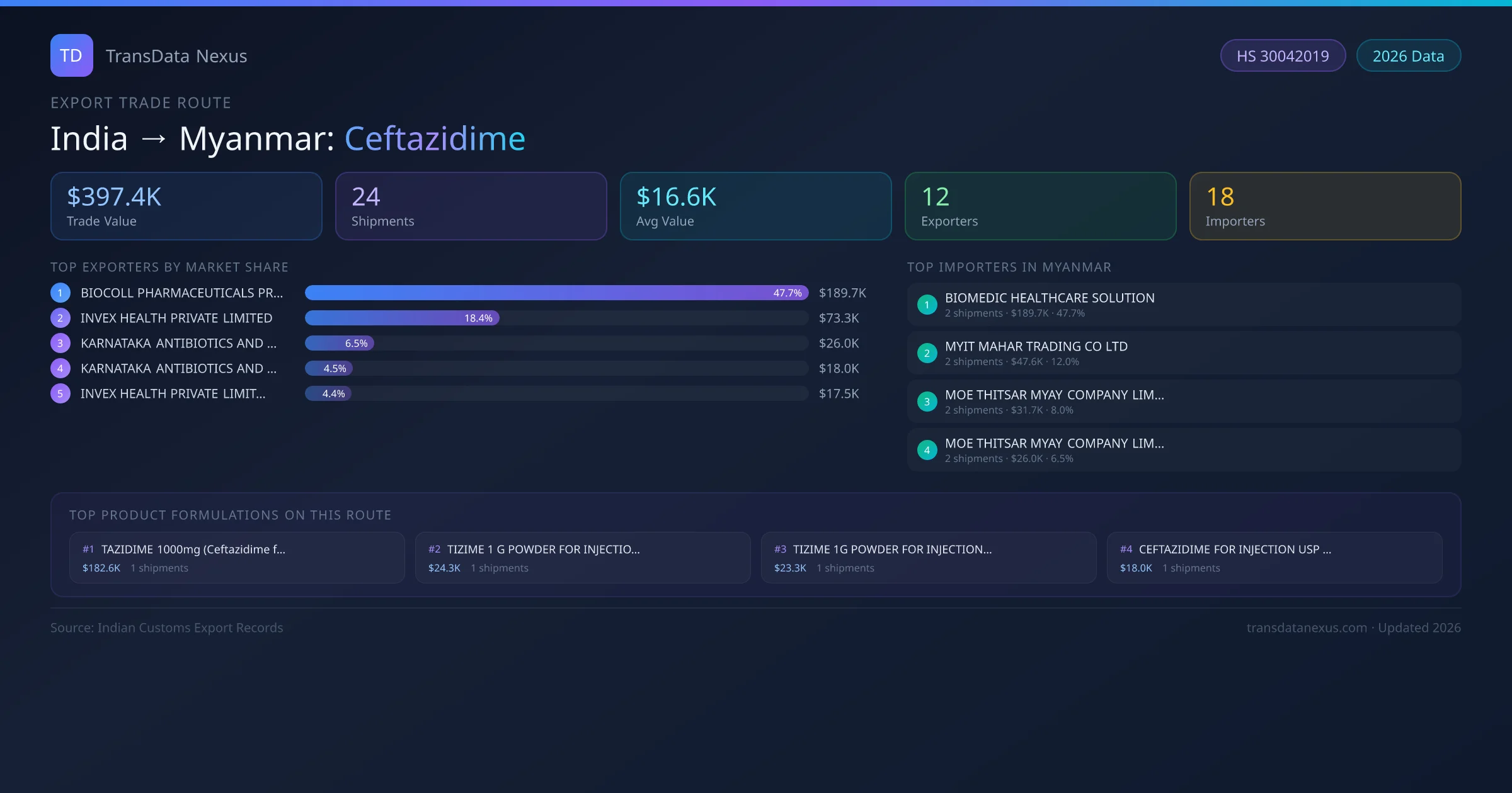- 1.Route Identification: India to Myanmar export trade corridor identified from Indian Customs (DGFT) records for Ceftazidime.